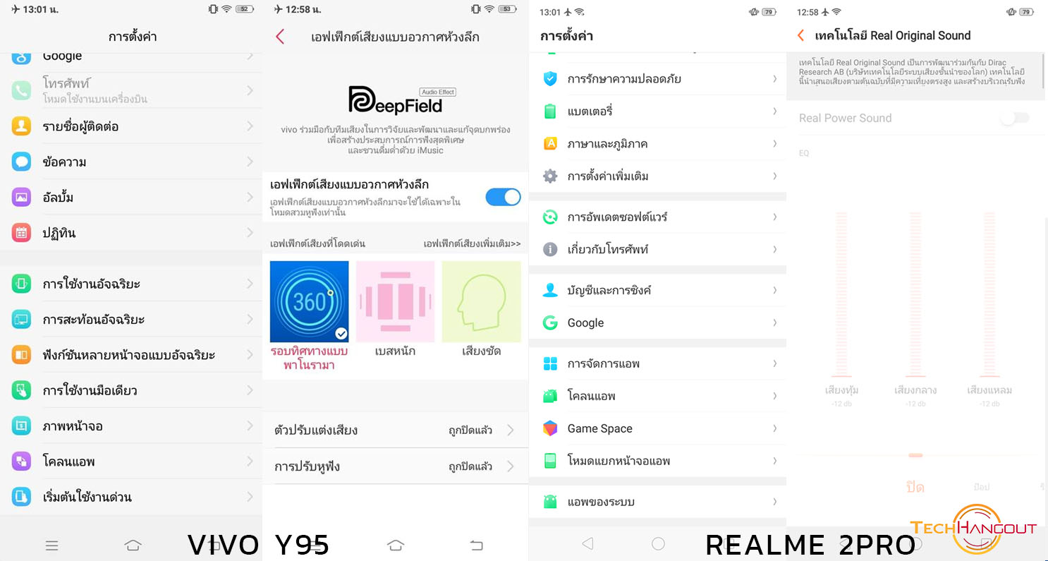 หน้าตาการตั้งค่าการใช้งานอะไรพวกฟีเจอร์เสริม โคลนแอพ โหมดเกม แบ่งหน้าจอ ล็อคแอพ อะไรพวกนี้นั้นมีมาให้คล้ายๆกันในการใช้งานครับผม ส่วน การปรับแต่งเสียงนั้นหน้าตาของทาง Vivo จะมีการเลือกปรับได้มากกว่าทั้งเสียงแบบทิศทางต่างๆและตัวหูฟังรวมถึง EQ แต่ในด้านของ Realme นั้นปรับแต่งในเรื่องของ EQ ได้เหมือนกันครับแต่ไม่มี Effect และปรับย่านเสียงแถบต่างๆนั้นได้น้อยกว่าของ Vivo ครับผม