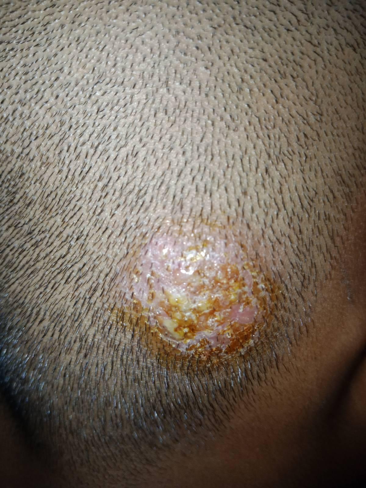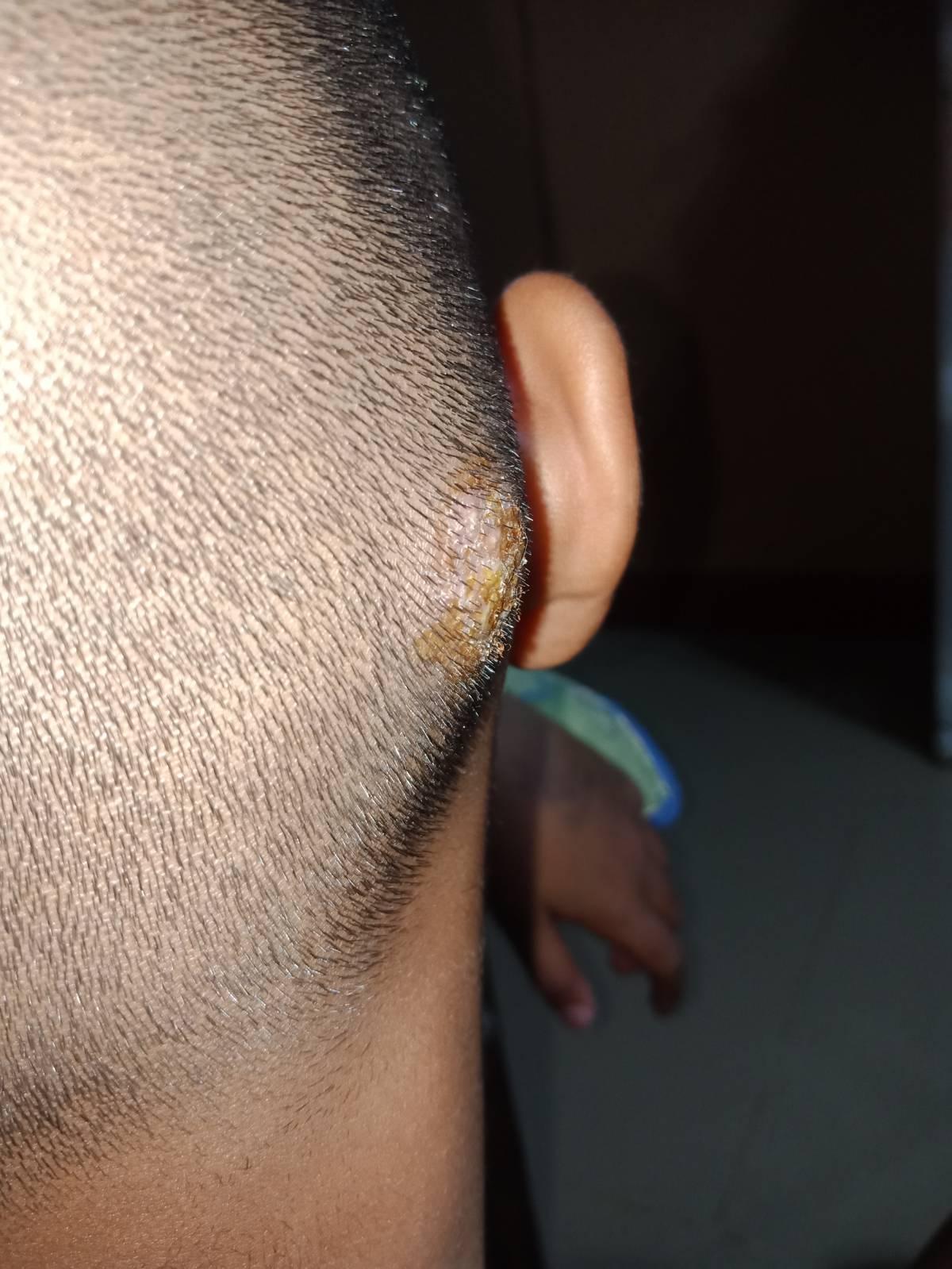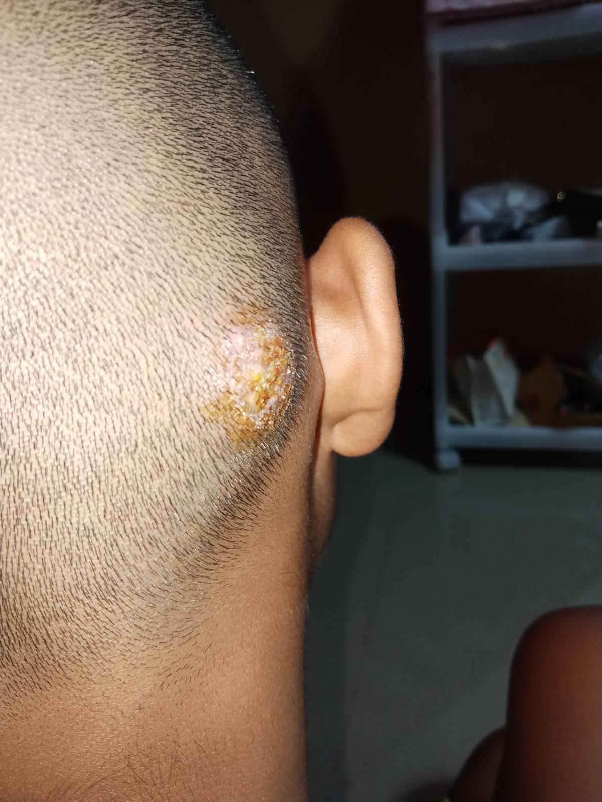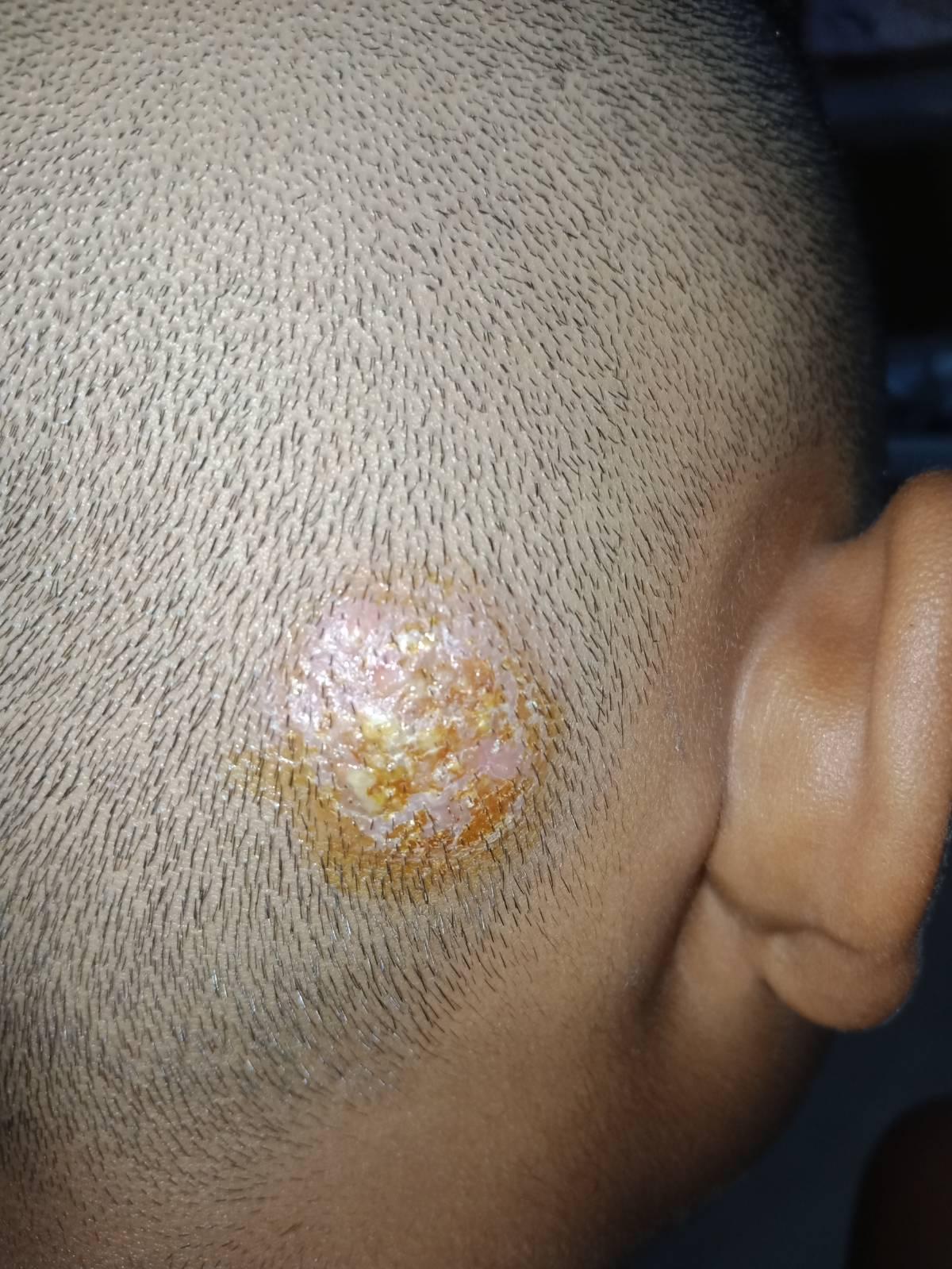เริ่มต้นน้องเป็นเหมือนกลากวงเล็กๆเท่าเหรียญ 50 สตางค์ พาน้องไปหาหมอ หมอให้ยากลากเกลื้อนมาทา ทาไปได้ 4 วันวงขยายกว้างมีอาการบวมแดง ไปหาหมอใหม่ หมอยังยืนยันว่าเป็นกลาก ให้ยาเชื้อราเป็นยาทานมาด้วยและยาฆ่าเชื้อ พร้อมเปลี่ยนยาทา ผ่านไป 1 สัปดาห์วงขยายใหญ่เท่าเหรียญ 10 บวมแดงมีหนอง นูนขึ้นมา ต่อมน้ำเหลืองที่คอโต แต่น้องไม่เจ็บที่คอ ที่แผลไม่คันไม่เจ็บแต่บวมแดงและน้ำน้ำใสๆออกมา สลับกับหนองเลยเปลี่ยนหมอ