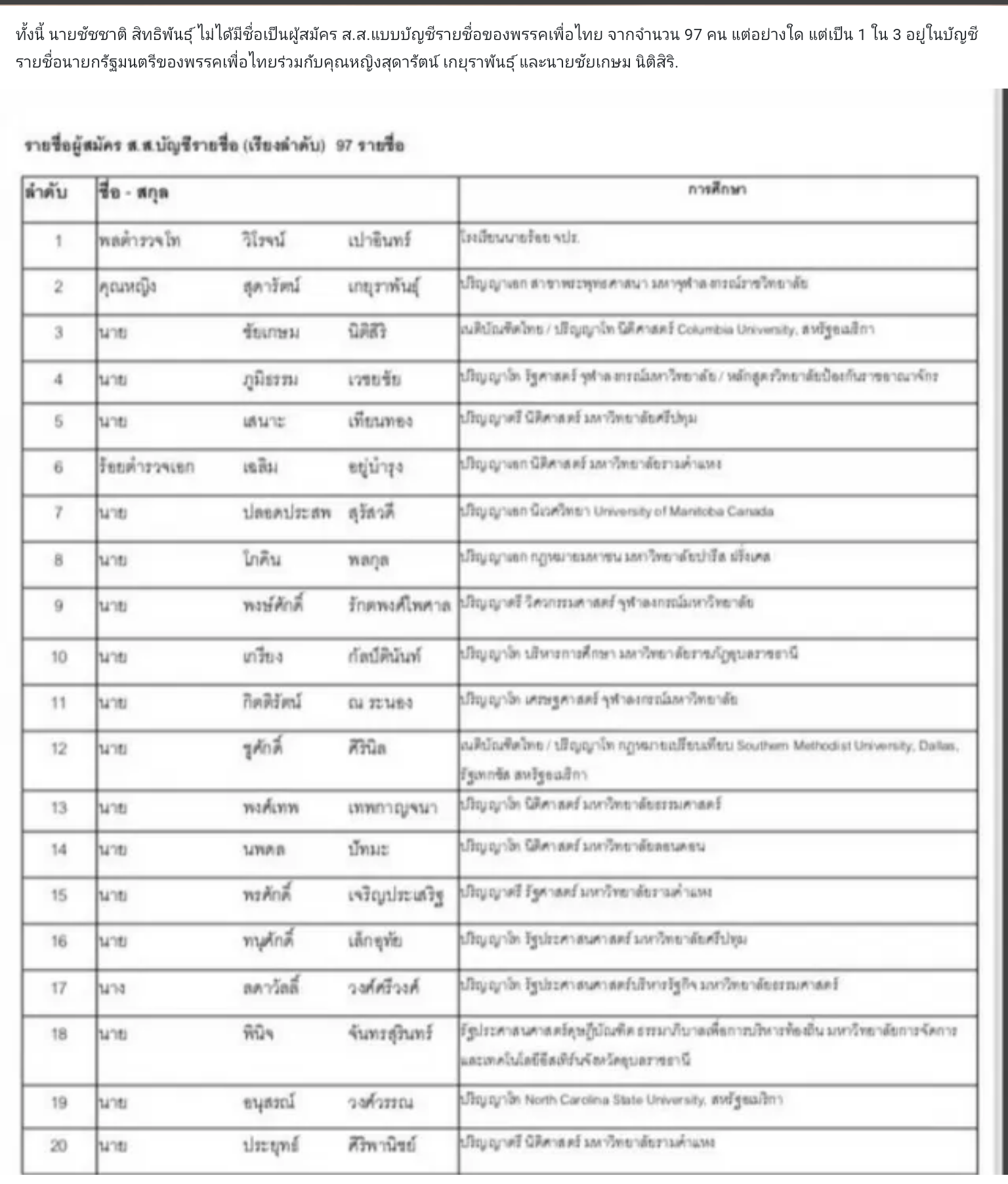 เปิดชื่อ 97 ผู้สมัคร ส.ส.ปาร์ตี้ลิสต์ พรรคเพื่อไทย ไม่มี "ชัชชาติ"