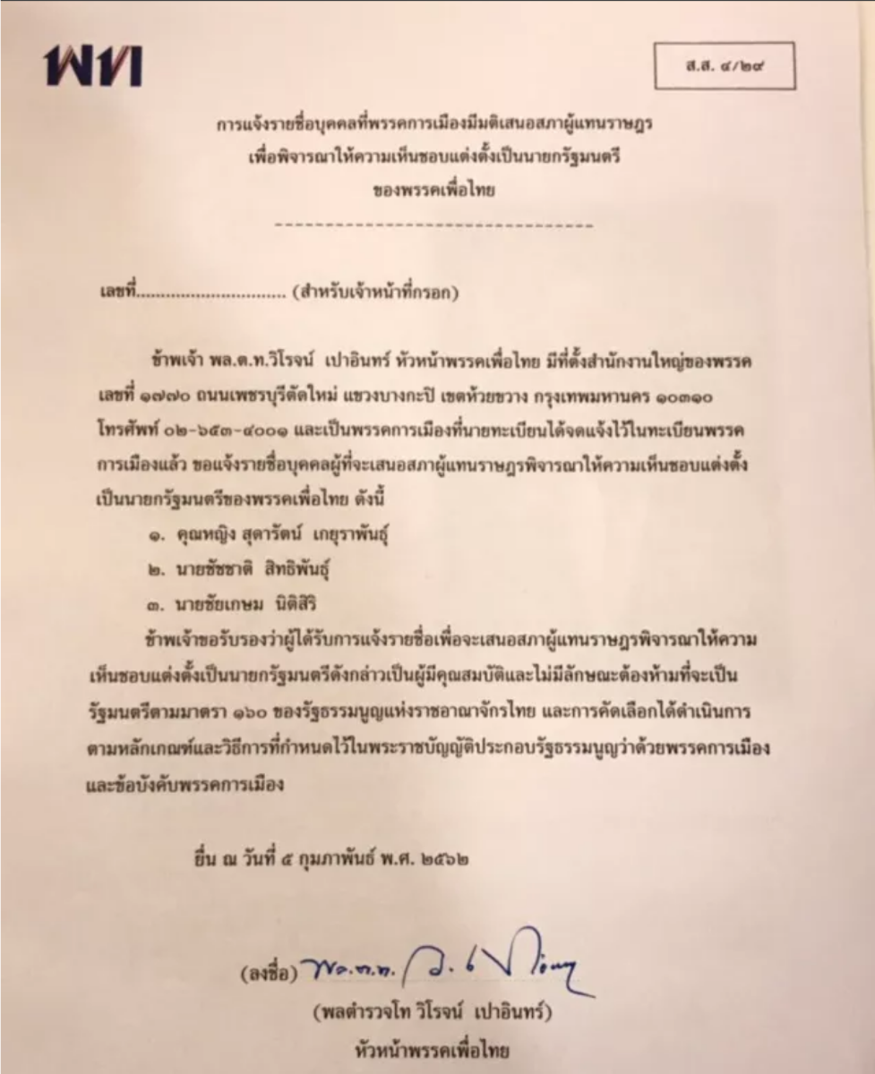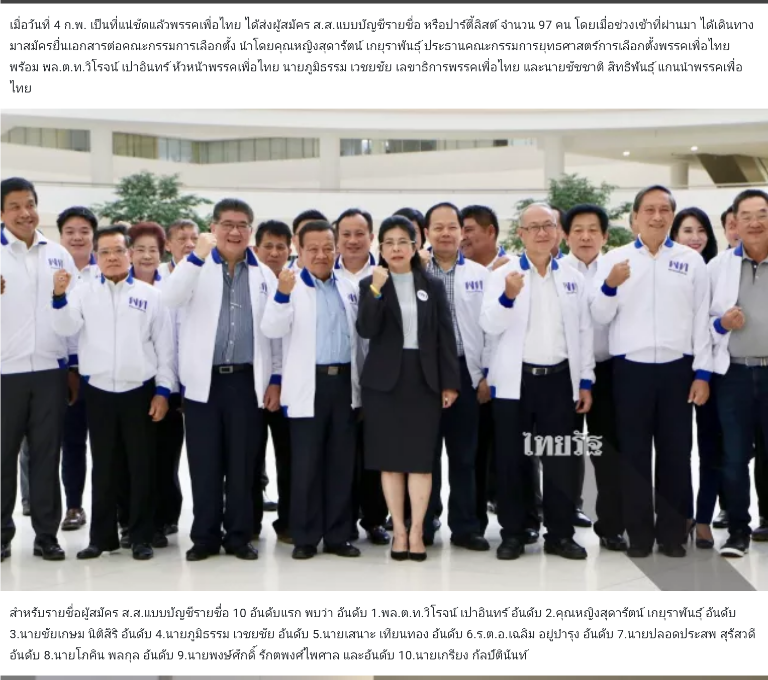 เมื่อวันที่ 4 ก.พ. เป็นที่แน่ชัดแล้วพรรคเพื่อไทย ได้ส่งผู้สมัคร ส.ส.แบบบัญชีรายชื่อ หรือปาร์ตี้ลิสต์ จำนวน 97 คน โดยเมื่อช่วงเช้าที่ผ่านมา ได้เดินทางมาสมัครยื่นเอกสารต่อคณะกรรมการเลือกตั้ง นำโดยคุณหญิงสุดารัตน์ เกยุราพันธุ์ ประธานคณะกรรมการยุทธศาสตร์การเลือกตั้งพรรคเพื่อไทย พร้อม พล.ต.ท.วิโรจน์ เปาอินทร์ หัวหน้าพรรคเพื่อไทย นายภูมิธรรม เวชยชัย เลขาธิการพรรคเพื่อไทย และนายชัชชาติ สิทธิพันธุ์ แกนนำพรรคเพื่อไทย
