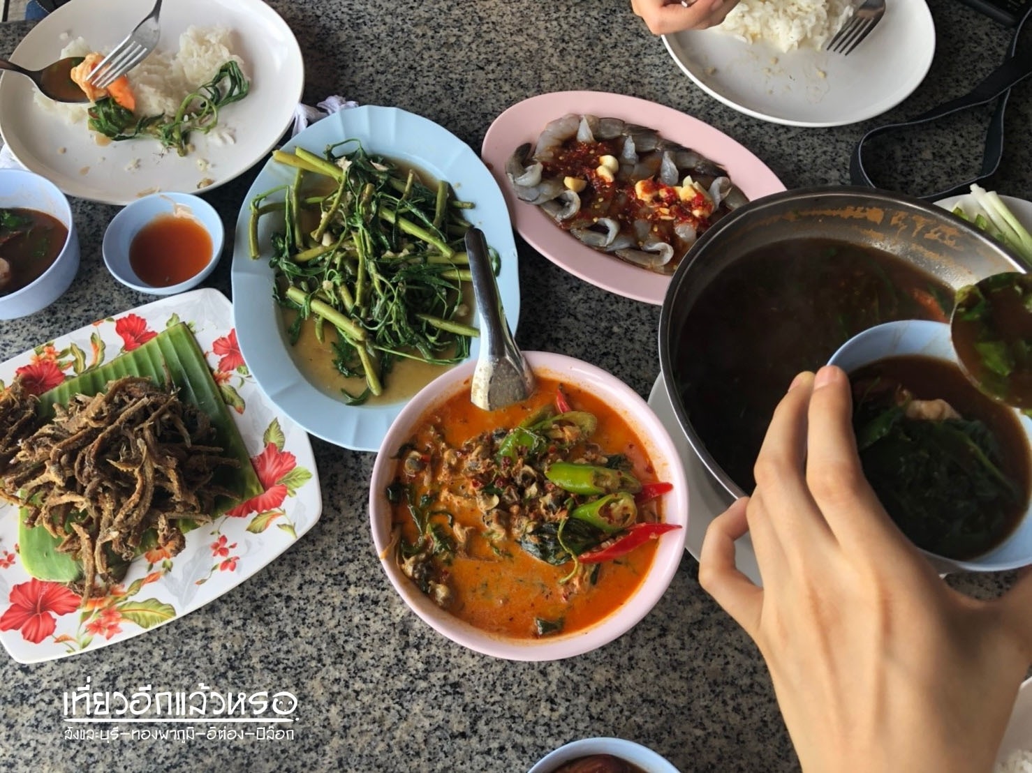 ร้านนี้ค่อนข้างใหญ่เลยทีเดียว ร้านตั้งอยู่ริมแม่น้ำกลอง มื้อนี้สั่งมาหลายอย่างมาก ราคาจัดว่าถูกเลย