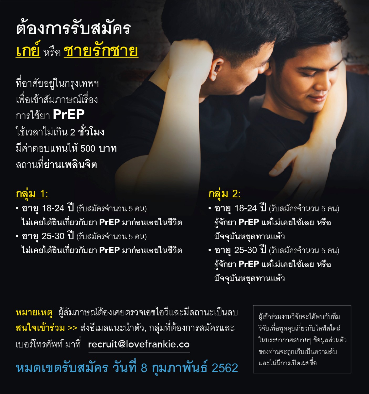 รับสมัครชายรักชาย สัมภาษณ์เรื่องยาPrEP กทม ค่าตอบแทน500บาท