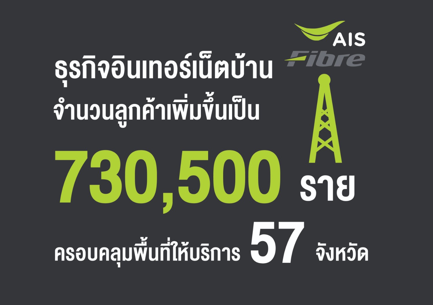 สำหรับธุรกิจอินเทอร์เน็ตบ้าน เอไอเอส ไฟเบอร์ มีลูกค้ามาใช้บริการเพิ่มขึ้นกว่า 209,300 ราย หรือคิดเป็นกว่า 20% ของการเติบโตของตลาด ทำให้ปัจจุบัน เอไอเอส ไฟเบอร์ มีลูกค้าจำนวน 730,500 ราย พร้อมทำตลาดต่อเนื่องด้วยกลยุทธ์ Fixed–Mobile Convergence