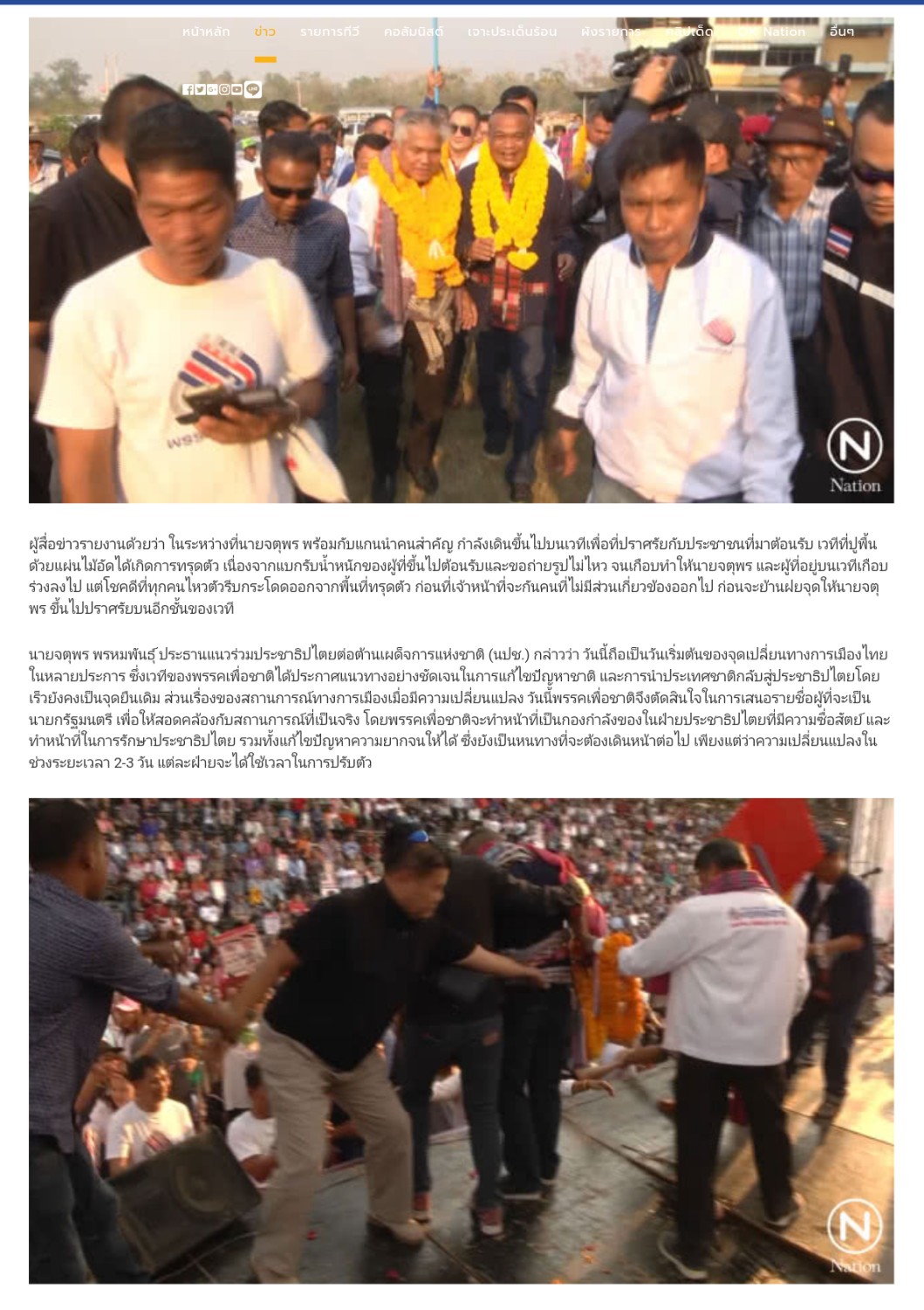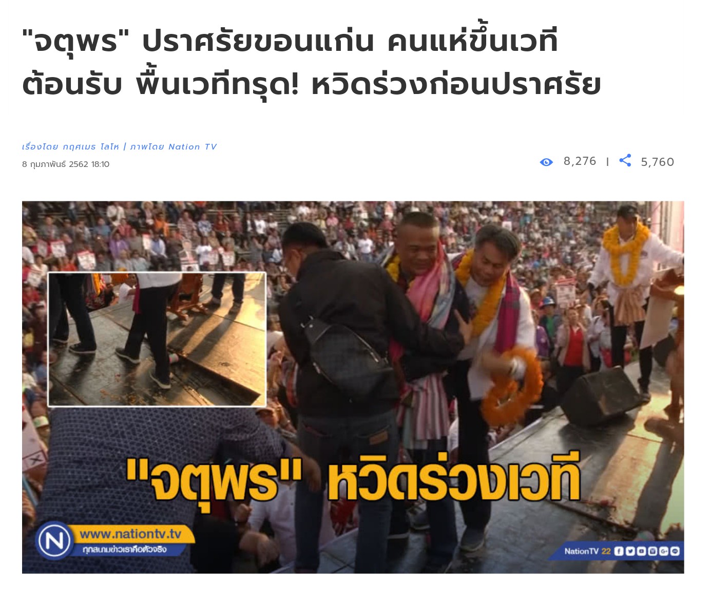เมื่อเวลา 15.00 น. วันที่ 8 ก.พ.62 ที่สนามม้า จังหวัดขอนแก่น นายสงคราม กิจเลิศไพโรจน์ หัวหน้าพรรคเพื่อชาติ และคณะ พร้อมทั้งผู้ช่วยหาเสียง นายจตุพร พรหมพันธุ์ ประธานแนวร่วมประชาธิปไตยต่อต้านเผด็จการแห่งชาติ (นปช.) และ นายยงยุทธ ติยะไพรัช เปิดเวทีปราศรัยหาเสียงและย้ำจุดยืนทางการเมือง โดยมีประชาชนในพื้นที่จังหวัดขอนแก่นและจังหวัดใกล้เคียงเดินทางมาต้อนรับและร่วมรับฟังการปราศรัยกว่า 3,000 คน โดยในช่วงก่อนที่นายจตุพร พรหมพันธุ์ จะขึ้นเวทีพบปะกับประชาชน ได้มีแกนนำคนสำคัญสลับกันขึ้นปราศรัยกับประชาชนอย่างต่อเนื่อง อาทิเช่น นายยศวริศ ชูกล่อม หรือ "เจ๋ง ดอกจิก" ที่ขึ้นปราศรัยเกี่ยวกับความตกต่ำของสภาพเศรษฐิจและความเป็นอยู่ของประชาชนในช่วงหลายปีที่ผ่านมา พร้อมกับชูนโยบายในการหาเสียงเลือกตั้งของพรรคเพื่อชาติ อาทิเช่น รพ.สต.ทันสมัย , 1 ตำบล 1 นักศึกษาแพทย์ , โฉนดใบเดียว , ตัดตอนสัมปทานเพื่อคนจน และ ผังเมืองใหม่ ท่ามกลางเสียงเชียร์ของประชาชน