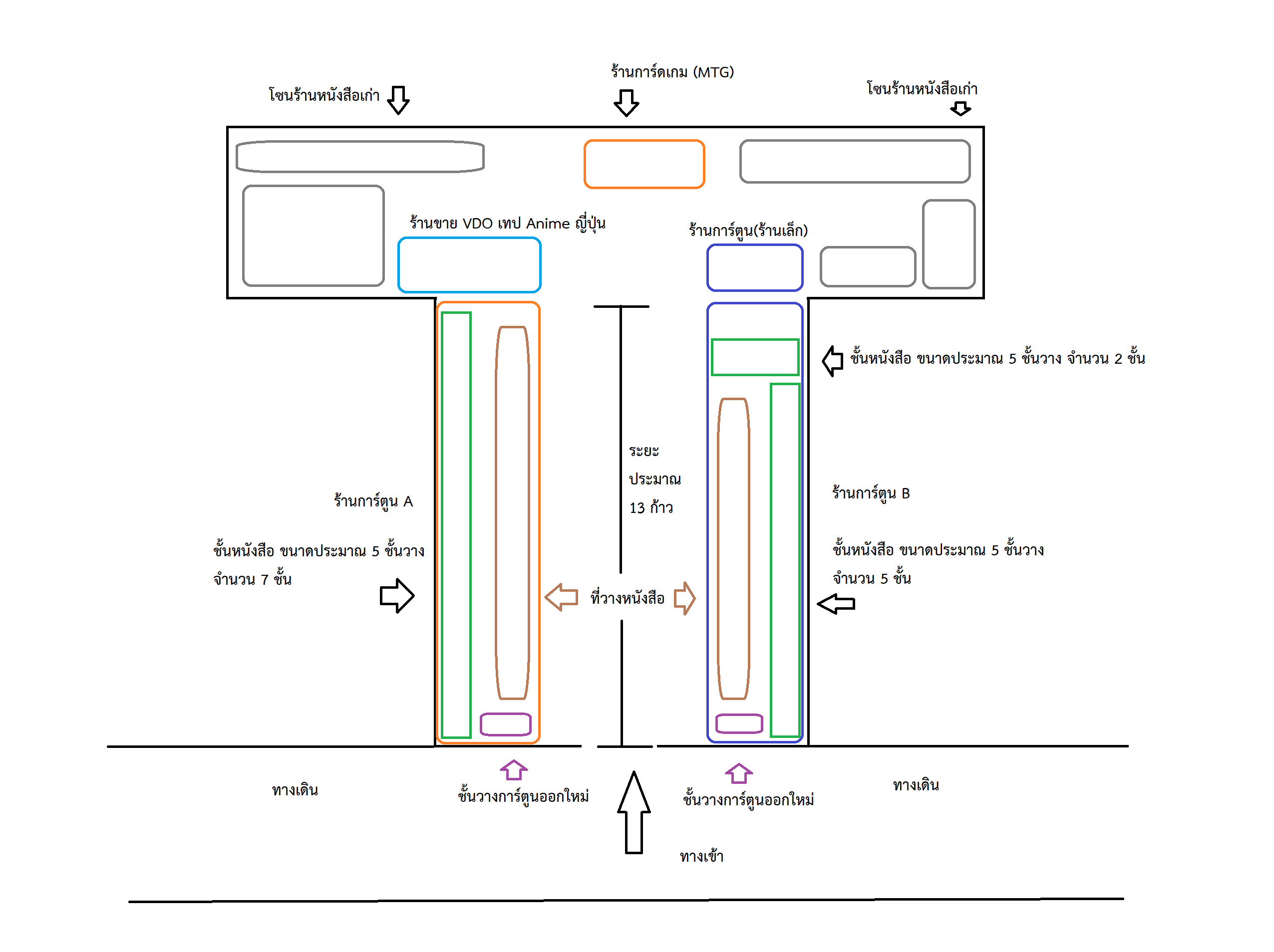 นี่คือโครงร่างของโซนขายหนังสือการ์ตูนที่เซ็นทรัลลาดพร้าวตามความทรงจำของผู้เขียน จะเห็นว่ามีร้านการ์ตูนใหญ่ถึง 2 ร้านตั้งหันหน้าชนขายแข่งกันเลยทีเดียว ข้างในยังมีร้านหนังสือเก่า ร้านการ์ตูนเล็ก ๆ อีกร้านหนึ่ง ร้านขาย VDO เทป การ์ตูนญี่ปุ่นแบบพากย์เสียงภาษาญี่ปุ่น น่าจะยังไม่มีคนทำซัพไทยให้ในยุคนั้น และร้านการ์ดเกม MTG