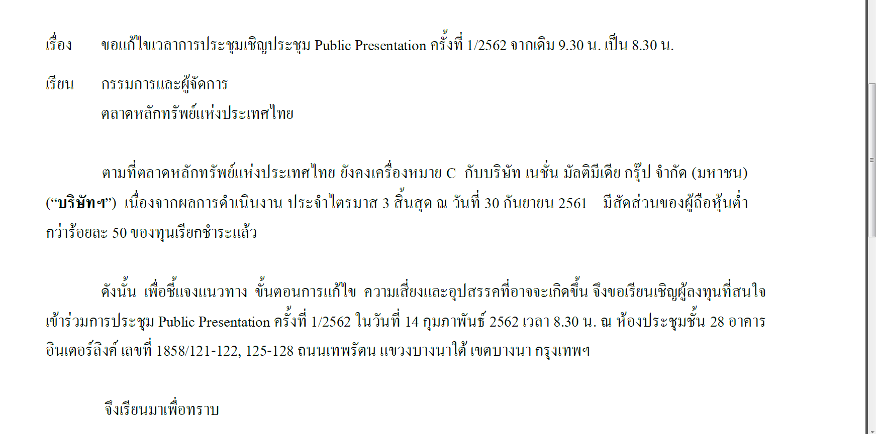วันนี้ 12/2/2562 ได้ประกาศประชุมผู้ถือหุ้น 14/2/2562