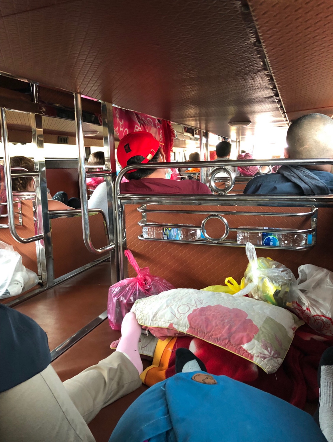 รถเต็มและแออัดไปด้วยฝรั่งมังคาที่เค้ามาเที่ยวบ้านเราและประเทศเพื่อนบ้าน สภาพคือรถนอนของแท้.. รถบังคับนอน เป็นเตียงสองชั้น ให้นอนช่องละ ๒ คน เป็น ๑ ล็อค ๔ คน ๒ บน ๒ คนล่าง เราก็อยู่ช่องเดียวกับแม่ ส่วนพ่อก็ไปอยู่กันคนญี่ปุ่นแล้ว ๕๕๕