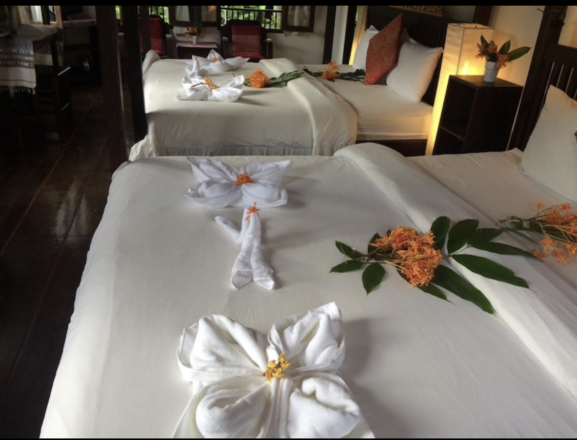นี่ที่พักเราคุ้มเซียงทอง บูทิก วิล่า ฉนนราคาสามคน หนึ่งคืน ๑๓๑๙ บาท เราจองห้องสามคนมา ห้องยังไม่ว่างเพราะยังไม่ถึงเวลาเช็คอิน