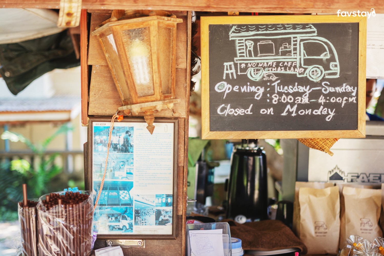 ขุมทรัพย์สำหรับคาเฟ่เลิฟเวอร์ บาริสต้าชงกาแฟอยู่บนรถกระบะคันจิ๋วสร้างความโดดเด่นให้กับคาเฟ่ทั่วๆไป No Name Caff มีความเจ๋งและสเน่ห์ในตัวของมัน กาแฟที่คั่วจากเม็ดกาแฟอาราบิก้าจากจังหวัดลำปาง ภาคเหนือของประเทศไทย โรบัสต้าจากจังหวัดประจวบคีรีขันธ์ ไม่เพียงแต่รสชาติที่กลมกล่อมของกาแฟ แต่การตกแต่งที่ละเมียดละไม ความหอมของกาแฟ กลิ่นไหม้นิดๆของกาแฟคั้วสด ล้างปากด้วยชาฟาง