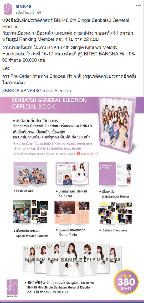 รายละเอียดสำหรับ BNK48 6th Single Senbatsu General Election 8 พฤศจิกายน 2561 เปิด Pre-order CD BNK48 5th Single BNK Festival Limited Edition และ Music Card Edition 3 ธันวาคม 2561 ปิด Pre-order CD BNK