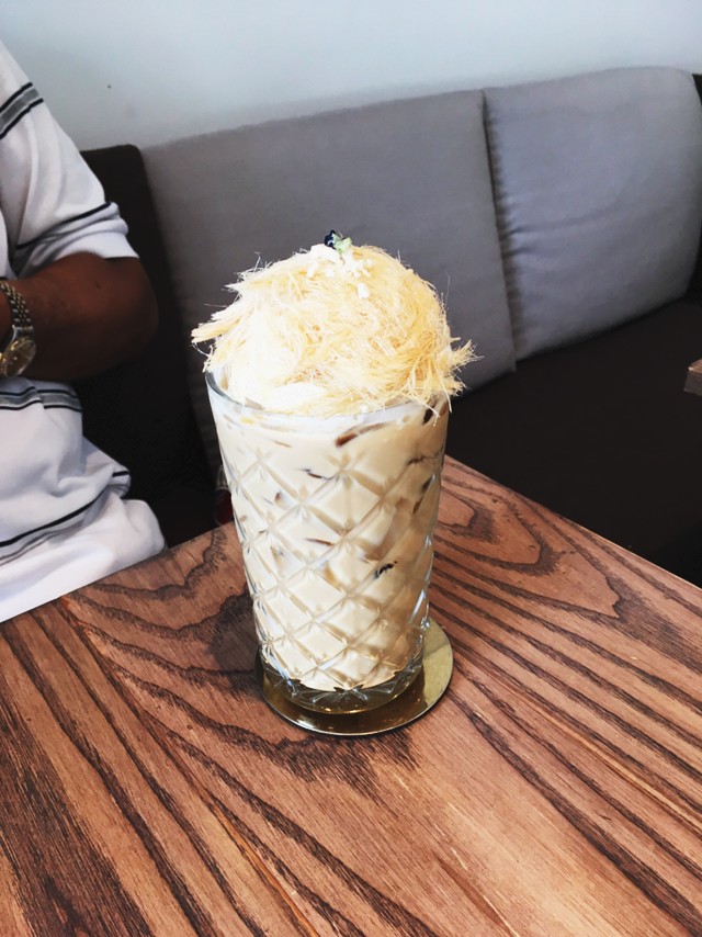 ส่วนแก้วนี้ ของคุณพ่อค่ะ เป็นกาแฟลาเต้ ใช้น้ำตาลมะพร้าวแทนน้ำตาลทราย โปะด้วยสายไหมด้านบน