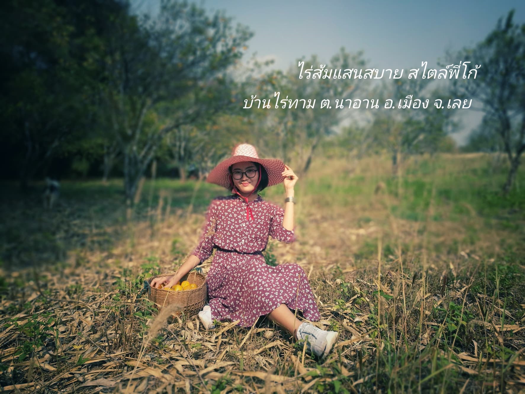สวนส้มแสนสบาย อยู่ที่บ้านไร่ทาม ต.นาอาน อ.เมือง จ.เลย เรานั่งรถออกจากตัวเมืองใช้เวลาไม่นาน ก่อนอื่นก็เปิดพี่กูเพื่อค้นหาพิกัดไร่ "ไร่ส้มแสนสบาย" แล้วก็ใช้นำทาง ตั้งแต่ทางเข้าไร่ก็จะมีป้ายบอกเล็ก ๆ เรามั่นใจเพราะพี่กูบอกว่าสิ้นสุดการค้นหาแล้ว จึงจอดรถที่สวนของใครก็ไม่รู้ มีหมาร่วม 16 ตัว วิ่งมาเห่าต้อนรับ บ่นพึมพำกันในรถสองคนน่าจะใช่แหละ สวนพี่โก้ไปทางไหนคะ นี่ไม่ใช่ต้องเลยไปอีก 200 เมตร ขอบคุณงาม ๆ ตามประสาคนมาเยือน เราหันหัวรถออกมา เจอแล้วพื้นที่สวนทอดยาว เบื้องหน้าเต็มไปด้วยหุบเขา ต้นไม้ล้อมรอบ