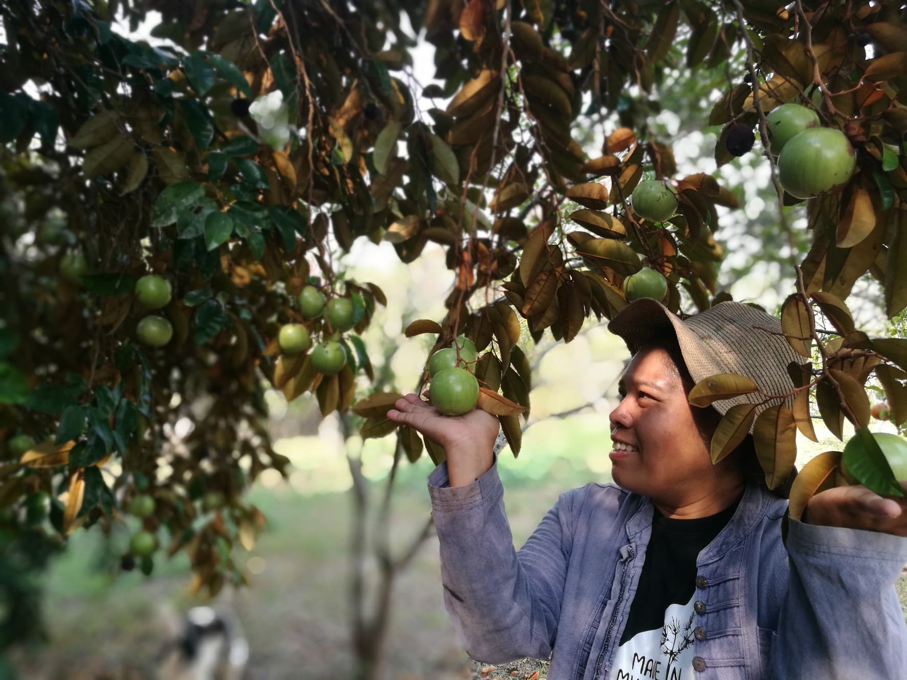 พี่โก้ยังชี้ให้เราเห็นว่าที่สวนปลอดภัยไร้สารขนาดไหน ดูได้จากไลเคนที่ขึ้นอยู่บนต้นส้ม ไลเคนคือตัวชี้วัดคุณภาพอากาศทางธรรมชาติ แสดงว่าอากาศดีไม่มีมลพิษหรือสารพิษ นี่เป็นความรู้ใหม่จากเรื่องใกล้ตัว เดินในสวนแดนร้อน แต่เย็นสบายเพราะสวนส้มติดลำน้ำและต้นไม้ใหญ่ล้อมรอบ ใกล้ ๆ ต้นส้มมีต้นหมากยาง หมากน้ำนม (อีสานเรียก) มีลูกคล้ายแอปเปิ้ล เวลาสุกจะเป็นสีม่วง บางสายพันธ์ก็มีสีเขียวเวลาสุกก็เขียวเหมือนเดิม ดกมากรอให้เราไปเชยชม เราเพลิดเพลินกับการกินส้มจนอิ่มหนำสำราญ และการชมหมากน้ำนม ถ่ายภาพอย่างจุใจ ได้เวลาที่เราจะต้องกลับบ้าน