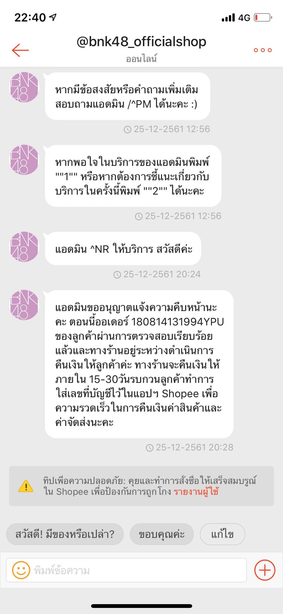 ในวันที่ 25 ธันวาคม 2562 ทาง shopee จึงแจ้งมาทางแชทว่าขอคืนเป็นเงินแทนการเคลมสินค้าให้ โดยสัญญาว่าจะคืนให้ภายใน 15-30 วัน รายละเอียดตามภาพสนทนาที่แนบ