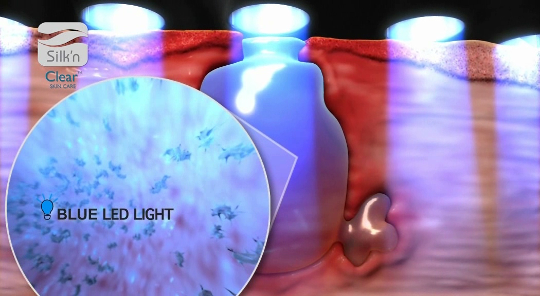 แสงสีฟ้าที่มีความยาวคลื่น 415 นาโนเมตร สามารถฆ่าเชื้อ P.Acnes ที่เป็นสาเหตุของการเกิดสิวได้โดยตรง และควบคู่กับการบำบัดด้วยคลื่นความร้อน Heat Therapy ใช้ความร้อนที่ 41 องศา ช่วยลดการผลิตน้ำมันของต่อมไขมัน สิวยุบเร็วขึ้น และช่วยกระตุ้นการสร้างคอลลาเจน