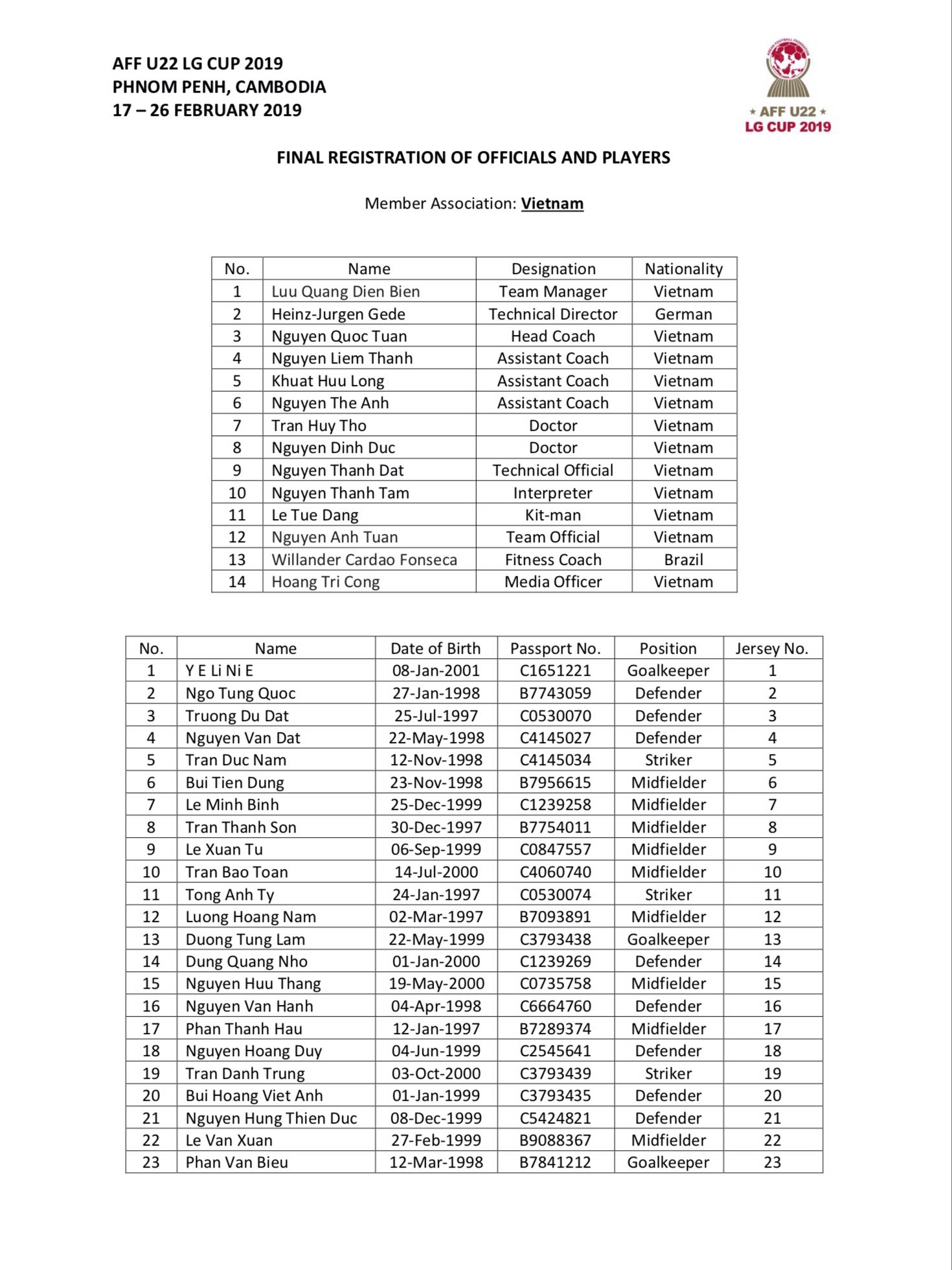-เวียดนามส่วนใหญ่เป็นผู้เล่นยู-19 รายการเอเอฟเอฟปี2017 และปี2018 เป็นส่วนใหญ่