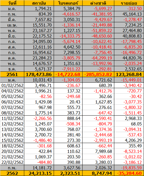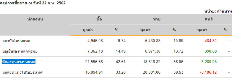 Sinthorn Summary 22/2/2562 : ต่างชาติซื้อสุทธิ 3,280.03 ลบ.
