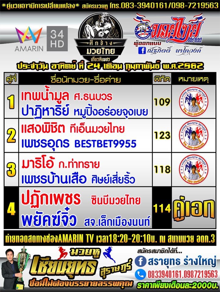 เทพน้ำมูล ส.ธนบวร การันตีคุณภาพโดย "เสี่ยตุ้ม"ธนบวร สิริคุณากรกุล เจ้าของสีเสื้อ "ศ.ธนบวร" มีชัยในศึกช้าง มวยไทย เกียรติเพชร พิกัด 109 ปอนด์ เมื่อวันที่ 24 ก.พ.62