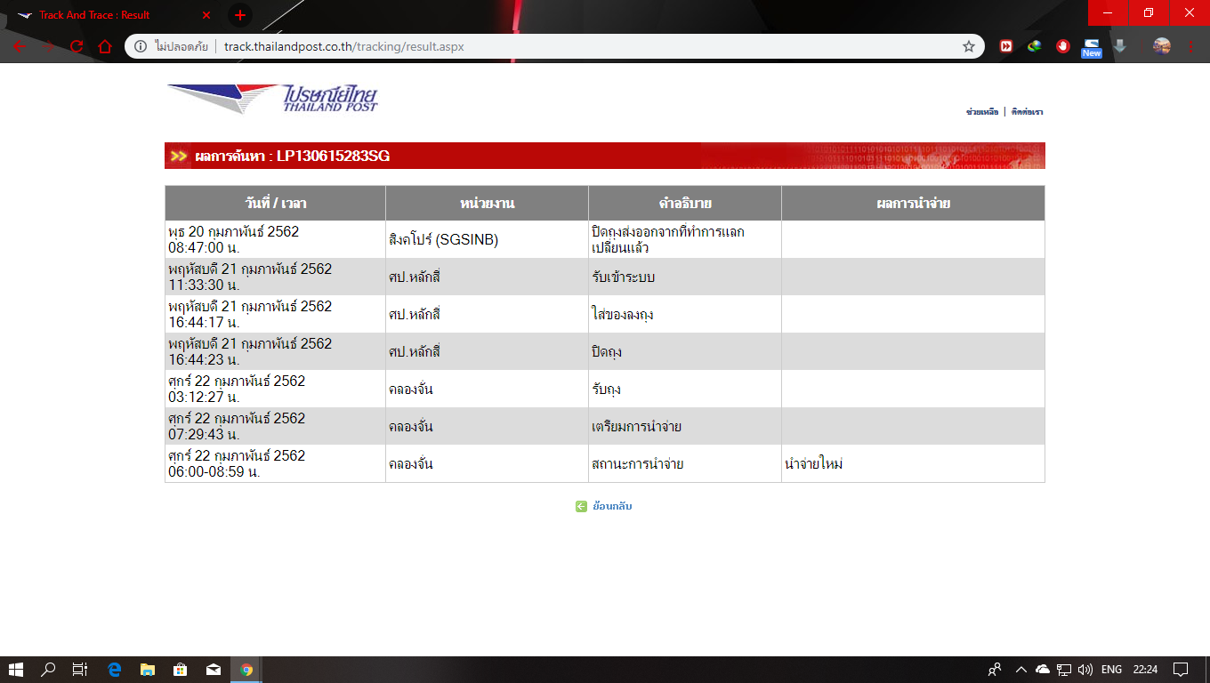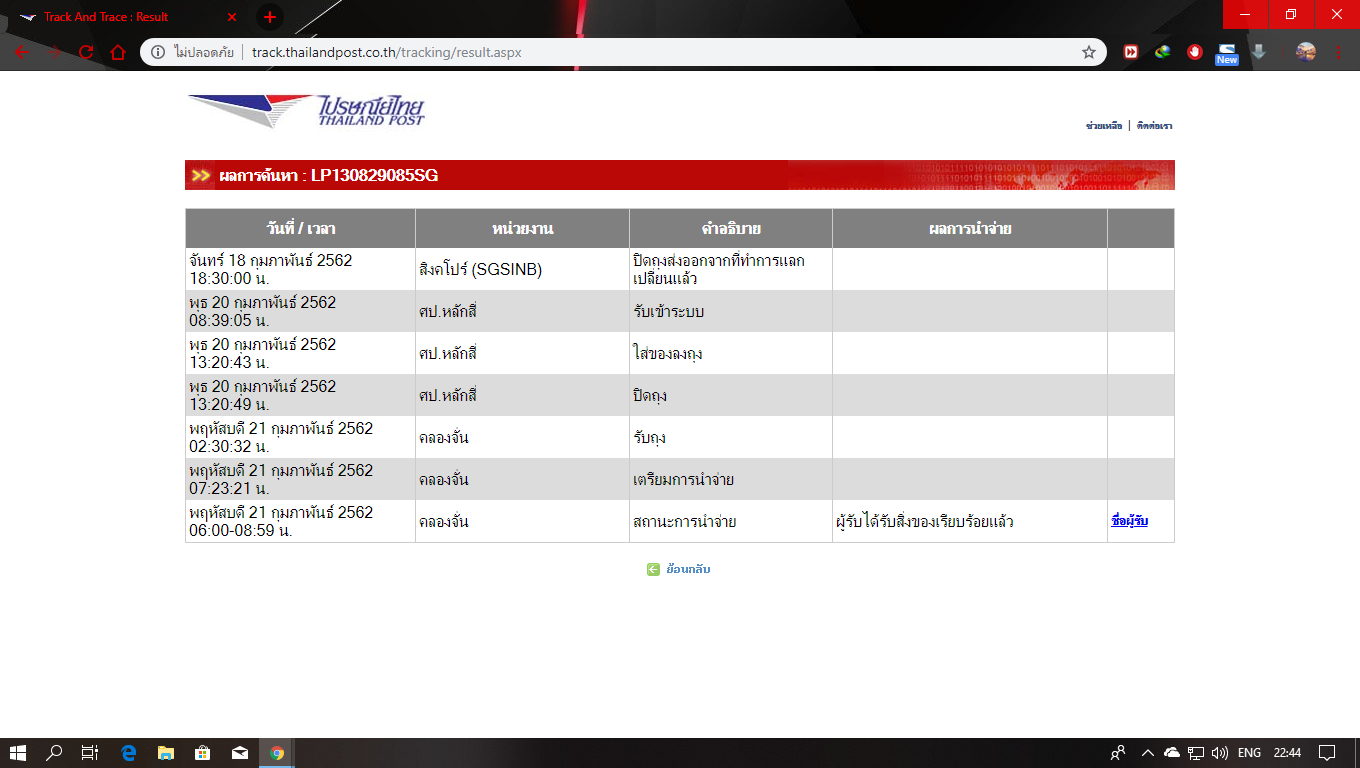 Track : LP130615283SG (13/02/19 ยังไม่ได้รับ)