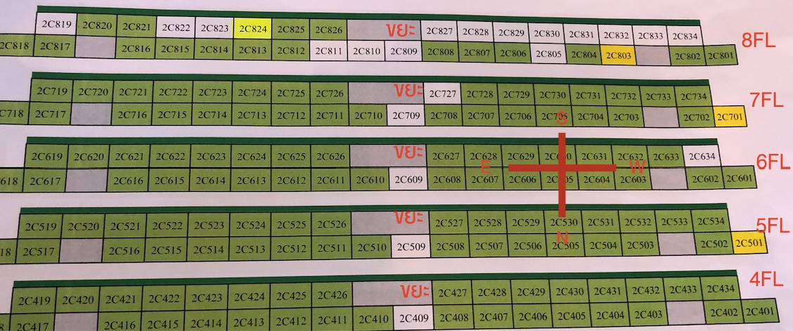 ตามรูปเลยครับ ห้องอยู่ที่ชั้น 6 (2C634) ห้องราคา 1150000 ตรงเส้นสีเขียวเข้มคือระเบียงครับ หันหน้าไปทิศใต้ครับ กำแพงห้องติดทิศตะวันตก