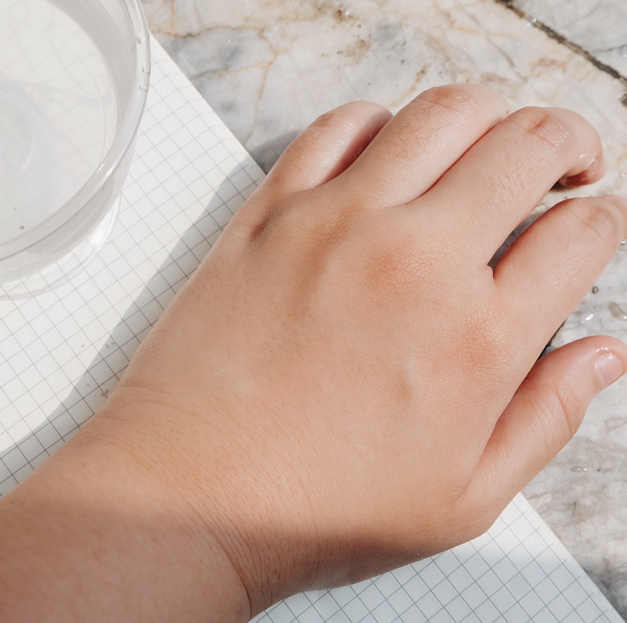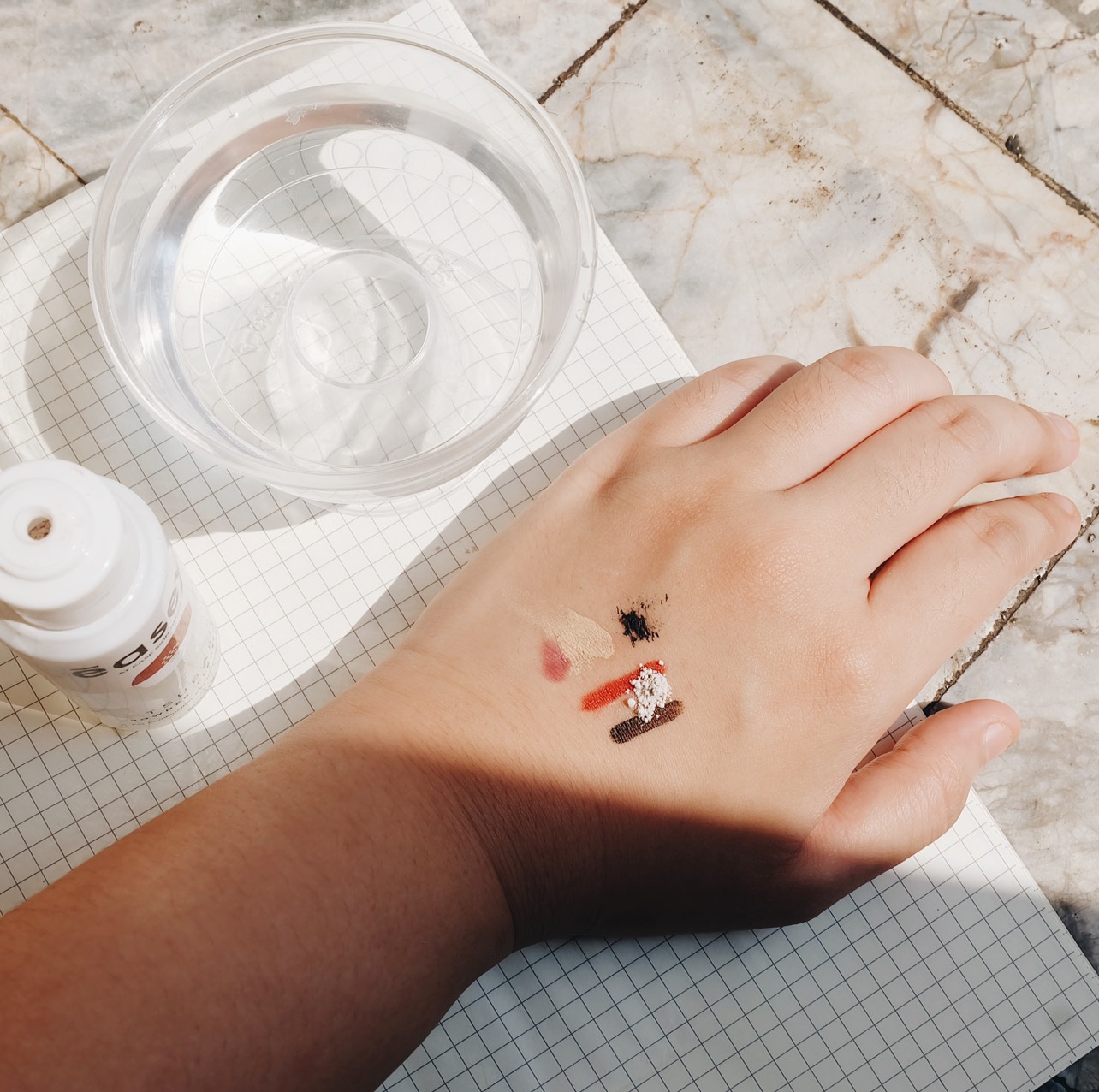 ทดลองที่หลังมือก่อนเนอะ กับเครื่องสำอางที่ทนน้ำได้ในระดับหนึ่ง