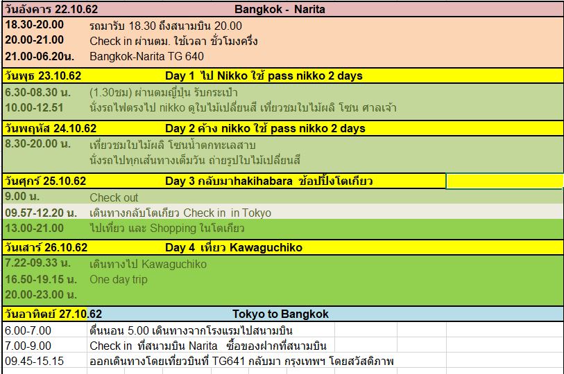 สำหรับแผนปัจจุบันที่คิดได้ กำลังคิดว่าถึงเช้าวันที่ 23 แล้วนั่งรถชินกันเซ็นต์ไปค้างนอกเมืองเลยดีไม๋ เดิมคิดจะไปค้าง nikko สองคืน 23-24 ตุลาคมใช้ nikko pass แล้วกลับโตเกียววันที่สามวันที่ 25 รุ่งขึ้นวันที่ 26 ไปคาวากูจิโกะแบบไปกลับ แล้วกลับกทม.เช้าวันที่ 27 ซึ่งแบบนี้ก็จะเสียเวลาวันที่สามไปวันนึงเลยกับการเดินทางนั่งรถกลับมาโตเกียวแต่ก็จะได้ช้อปปิ้งในโตเกียว