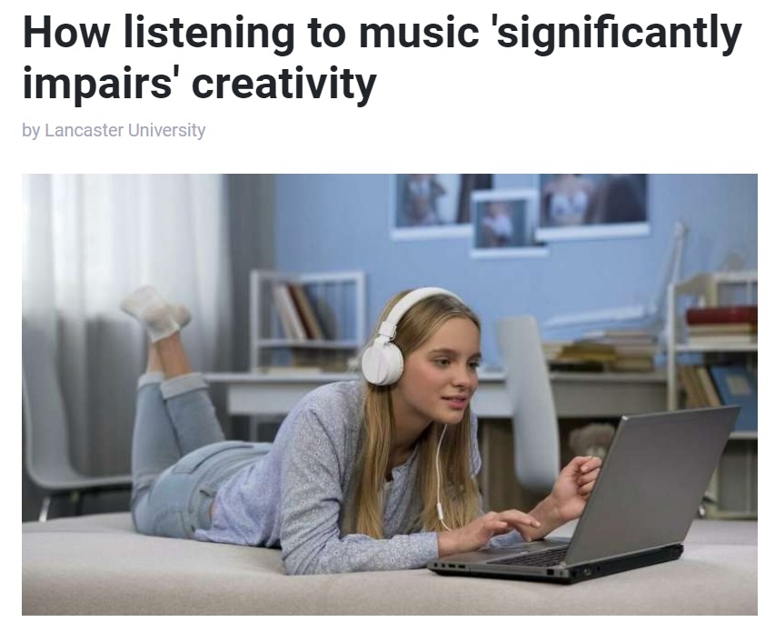 https://medicalxpress.com/news/2019-02-music-significantly-impairs-creativity.html?fbclid=IwAR1PCEVudsb84WL0NES9WaE2ioyjsaXvBtJRnqSwmTyKVQL8JfgfVahDYBI