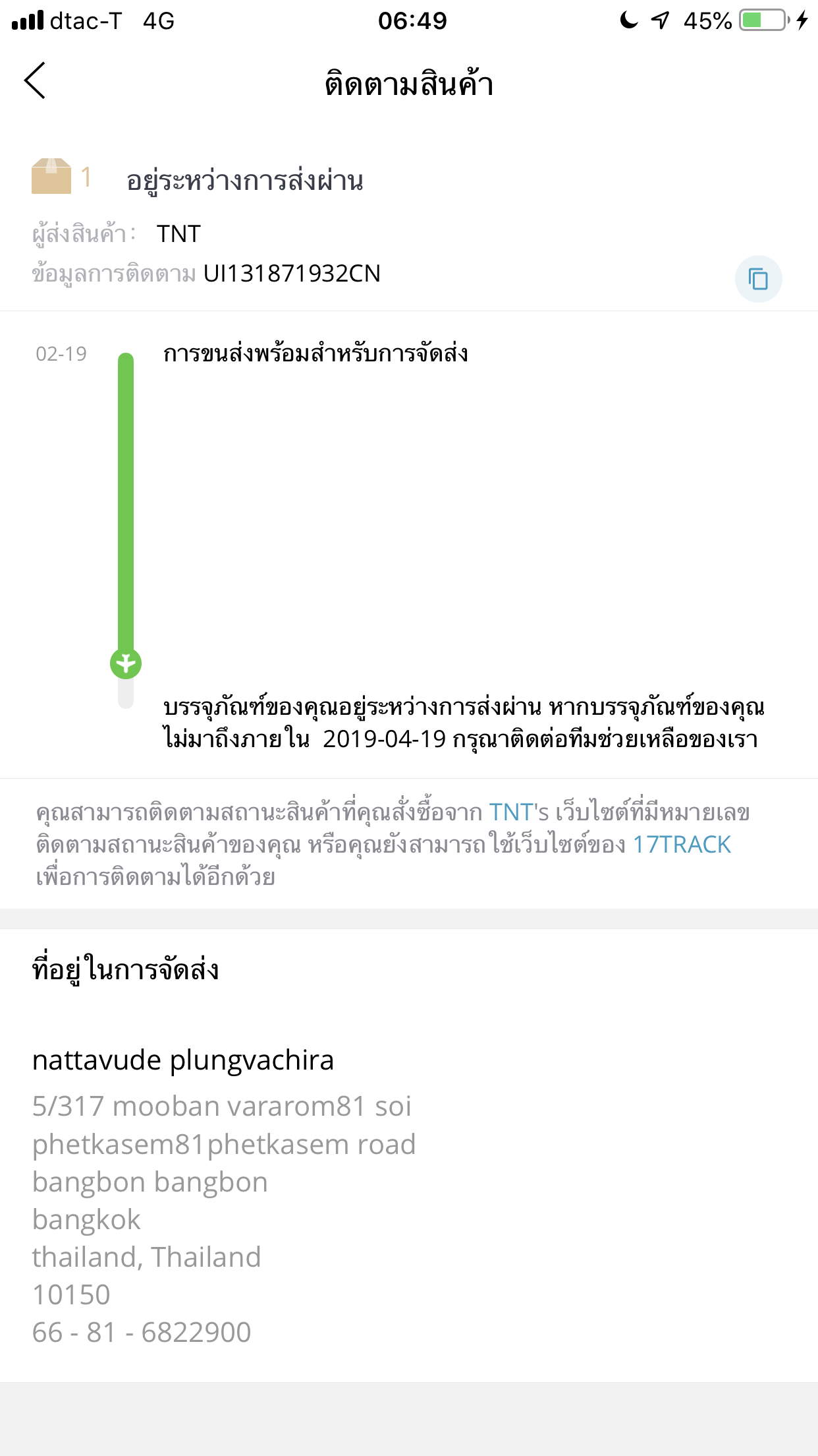 ของเราขึ้นแบบนี้ ไม่ทราบของถึงไทยหรือยังคะ แล้วที่บอกว่าบรรจุภัณฑ์ของคุณอยู่ระหว่างส่งผ่าน หมายความว่ายังไงคะ ขอบคุณค่ะ