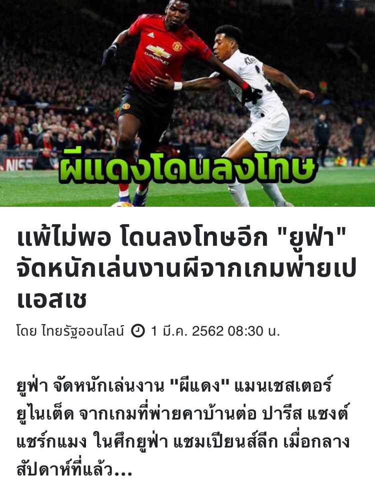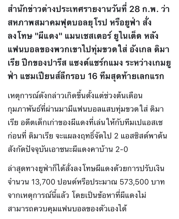 ....ล่าสุดทางยูฟ่าก็ได้สั่งลงโทษผีแดงด้วยการปรับเงินจำนวน 13,700 ปอนด์หรือประมาณ 573,500 บาท