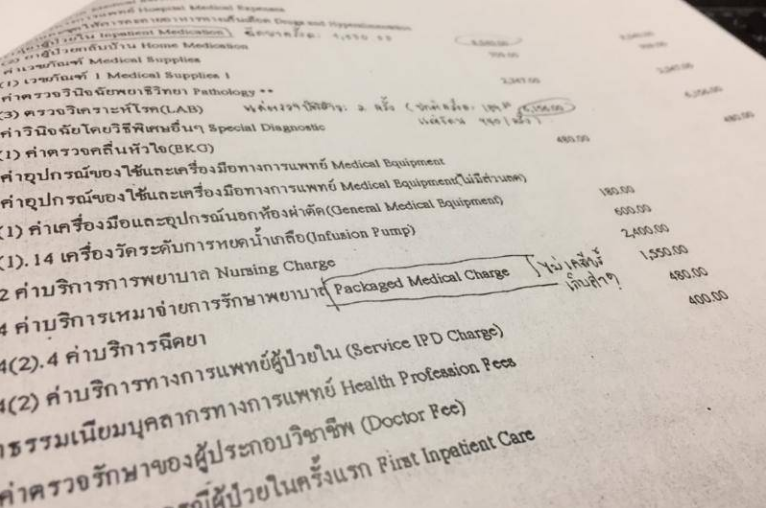 “วันที่ 2 ก็ไม่ได้มีการรักษาอะไรพิเศษนะค่ะ นอกจากวัดความดัน ดิฉันจึงออกจากโรงพยาบาลราวๆ 11.00 น. ทางโรงพยาบาลแจ้งค่าใช้จ่าย 3 หมื่นบาทจึงตกใจมาก ทำไมมันเยอะขนาดนั้น จึงสอบถามจากเจ้าหน้าที่ฝ่ายการเงิน เพราะปกติตามโปรแกรมตรวจสุขภาพประจำปี ค่าตรวจปัสสาวะเพียงครั้งละ 189 บาท แต่ต้องจ่ายถึง 940 บาท โดยเจ้าหน้าที่ตอบว่าใช้วิธีเดียวกันเก็บและห้องตรวจเดียวกัน แล้วทำไมราคาถึงสูงกว่ากัน ส่วนค่าน้ำเกลือ รวม 4 ถุง ราคาถุงละ 1,000 บาท เป็นน้ำเกลือที่แพงมาก ดิฉันคิดว่าเหมือนเป็นการขโมยเงินคนไข้ชัดๆ เราไม่ได้โวยวายเพื่อไม่ยอมจ่าย แต่เราเรียกร้องความเป็นธรรม คนในสังคมจะได้รู้ว่าจะพบเจอค่าใช้จ่ายอะไรบ้าง” ผู้ป่วยรายนี้ กล่าว
