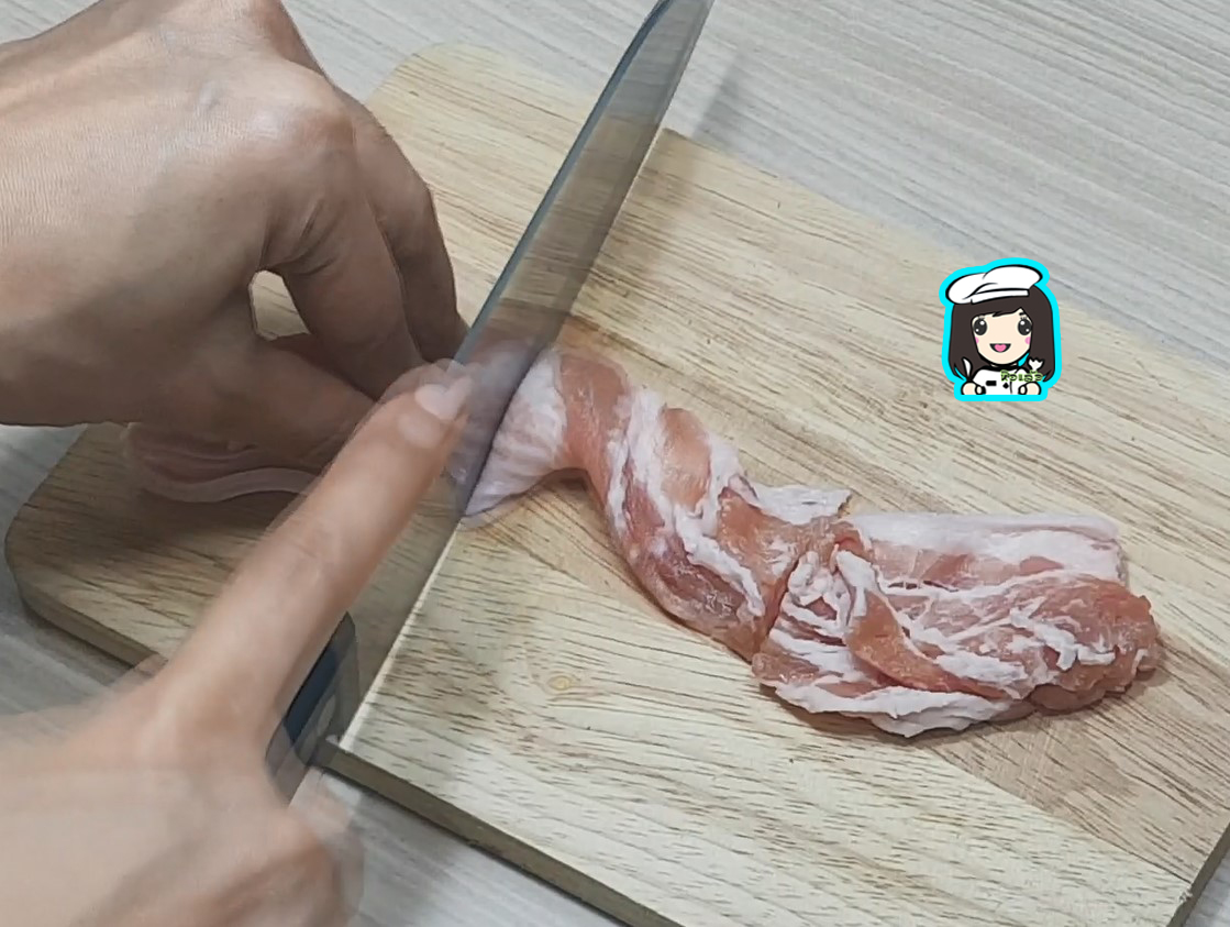 1.หั่นเบค่อนยาวประมาณ 2-3 นิ้ว