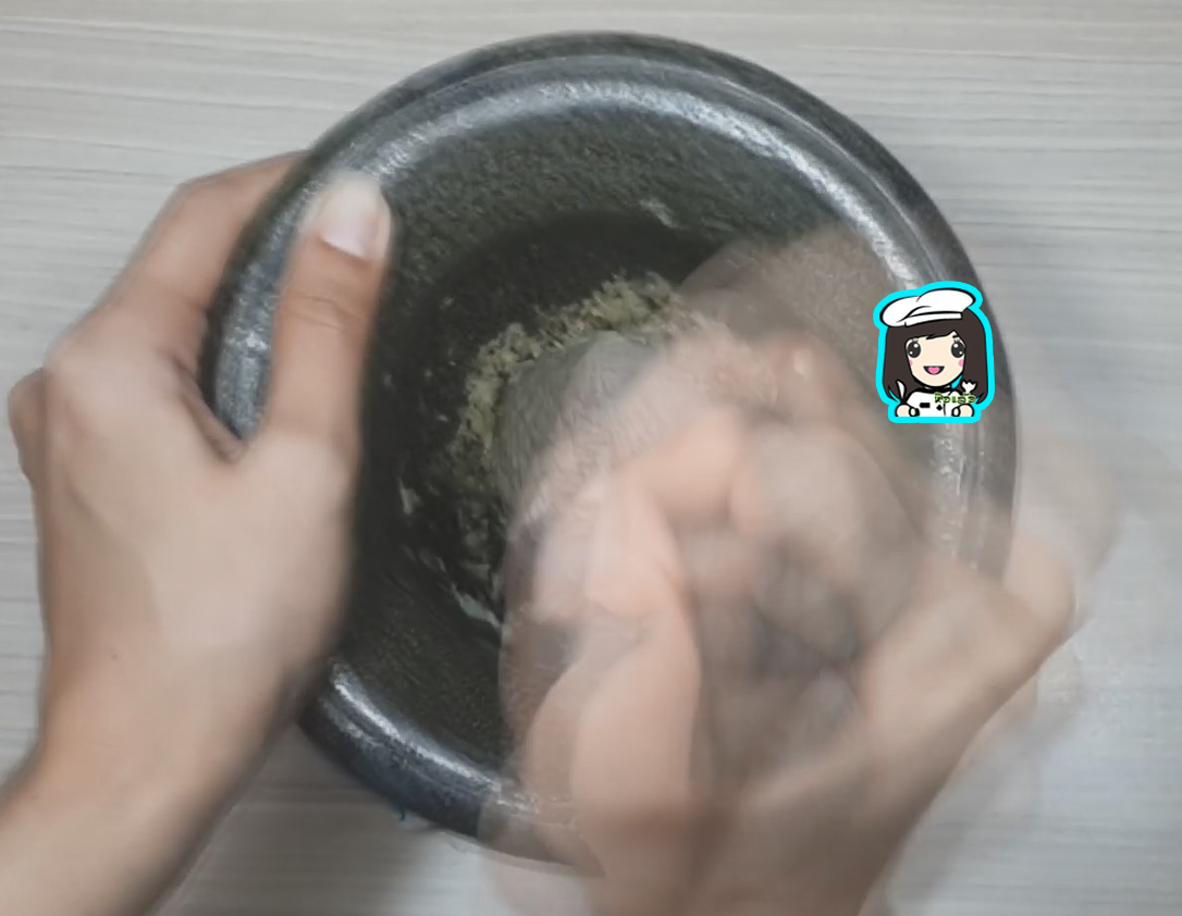 2.โขลกรากผักชี พริกไทยดำ กระเทียม ให้ละเอียด