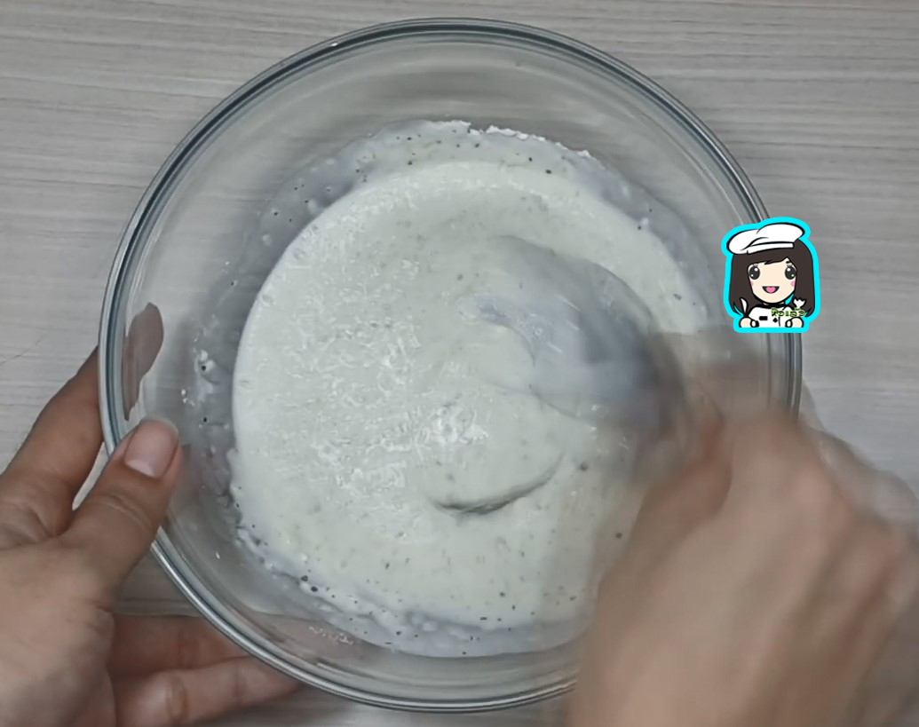 3.ผสมแป้งกับน้ำเย็นจัด คนให้แป้งเนียนละเอียดไม่เป็นเม็ดๆ ใส่สามเกลอลงไปคนให้เข้ากัน ให้เนื้อแป้งค่อนข้างหนืดเหลวนิดหน่อย