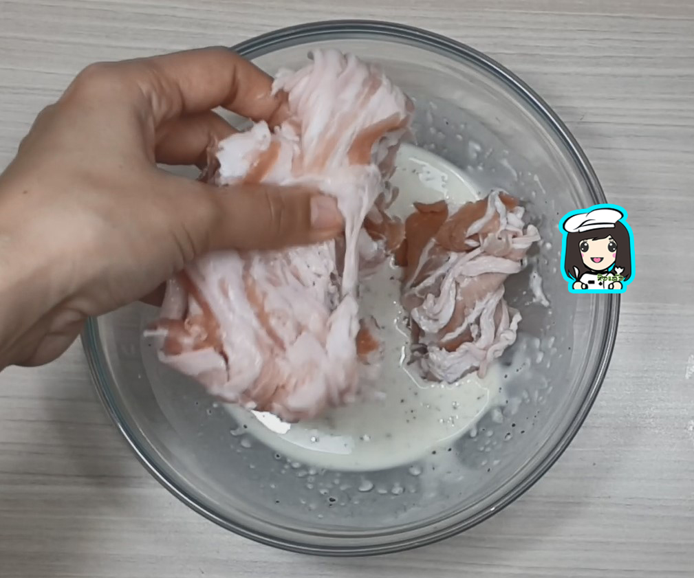 4.ใส่เบค่อนตามด้วยงาขาวคลุกเคล้ากับแป้งที่ผสมไว้ หมักไว้ประมาณ 15 นาที