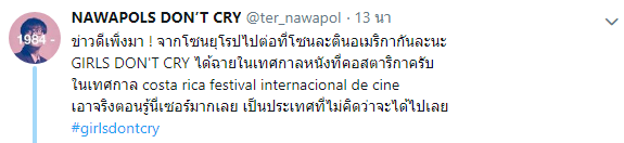 ก่อนอื่นดีใจกับพี่เต๋อด้วยนะครับ ผลงานได้บินไปฉายหลายงานหลายประเทศเลย ผลวิจารย์ดีด้วย รออ่านผลวิจารย์จากคนยุโรปอยู่! พี่เต๋ออิจิบัง!!! รายละเอียดจากเฟสบุ๊คพี่เต๋อนวพล GIRLS DON'T CRY / european prem