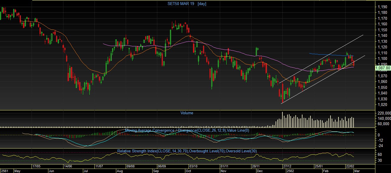 บางตัวเข้าสู่ภาวะ Over Bought และ เป็นโซนแนวต้านที่สำตัญ ซึ่งได้ทำให้ดัชนีร่วงหลุดแนวรับ เส้น EMA ทั้งสาม และ Support line ลงมาอย่างง่ายดาย หากบริเวณ Low เดิม ณ ระดับ 1080 จุด ไม่เห็นการฟื้นตัว ก็เป็นไปได้ที่ดัชนีกำลังจะเข้าสู่โหมดพักฐานอีกครั้ง