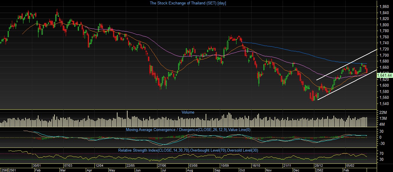 SET index TF Day: เมื่อสัปดาห์ที่ผ่านมา ดัชนี SET index มีความพยายามขึ้นไปยืนเหนือเส้น EMA200 วัน แต่ไม่สำเร็จ และย่อตัวลงมา เนื่องจากก่อนหน้านั้น เกิดสัญญาณ Bearish Divergence ปกคลุมไว้ ซึ่งทำให้เกิดเป็นรูปแบบแท่งเทียน “Dead cat bounce inverted” และในวันศุกร์ ดัชนีได้ลงมาพักตัวที่บริเวณเส้น EMA25 วัน ต้องมาดูกันว่า เร็ววันนี้ดัชนีจะสามารถฟื้นตัวขึ้นไปได้หรือไม่ หากฟื้นตัวขึ้นไปได้ และยืนเหนือ 1680 จุด ก็จะทำให้ภาพรูปแบบกลับตัว Inverse Head & Shoulder ชัดเจนขึ้น แต่ถ้าหากหลุดระดับ 1630 จุด ลงไป ก็จะกลายเป็น Bearish Flag พร้อมเข้าสู่โหมดพักฐานอีกครั้ง