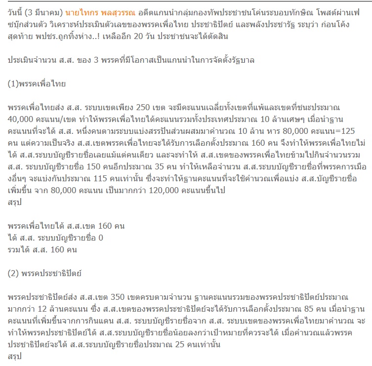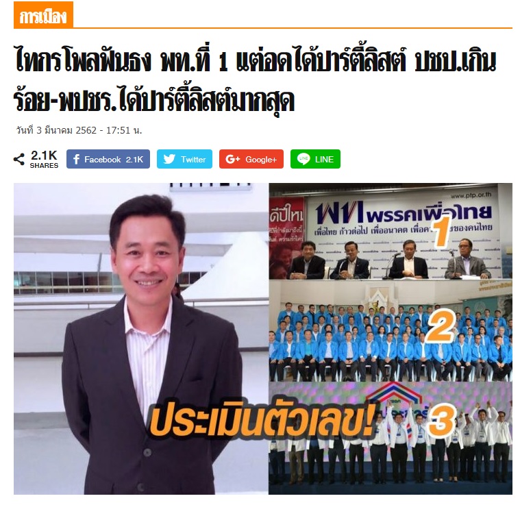 ไทกรโพลฟันธง พท.ที่ 1 แต่อดได้ปาร์ตี้ลิสต์ ปชป.เกินร้อย-พปชร.ได้ปาร์ตี้ลิสต์มากสุด