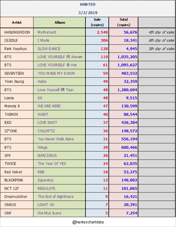 ยอดซื้ออัลบั้มจากชาร์ต HANTEO 3 มีนาคม 2562