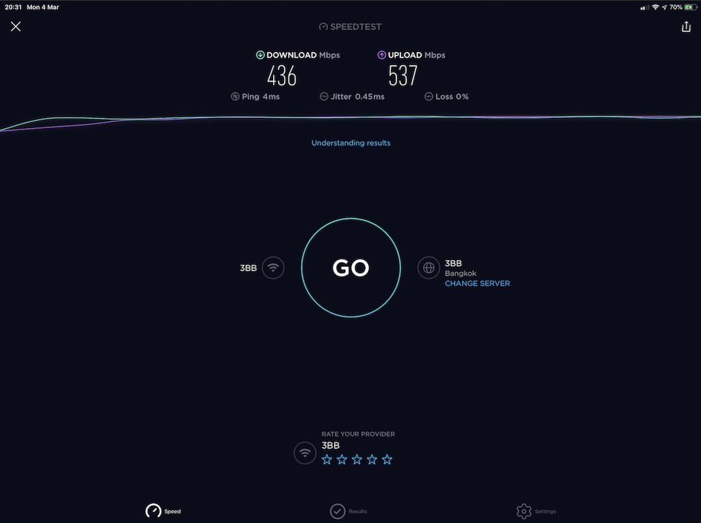 ผลการทดสอบ บน iPad Pro 2018 ช่วง 2 ทุ่มครึ่ง download: 436Mbps upload: 537Mbps