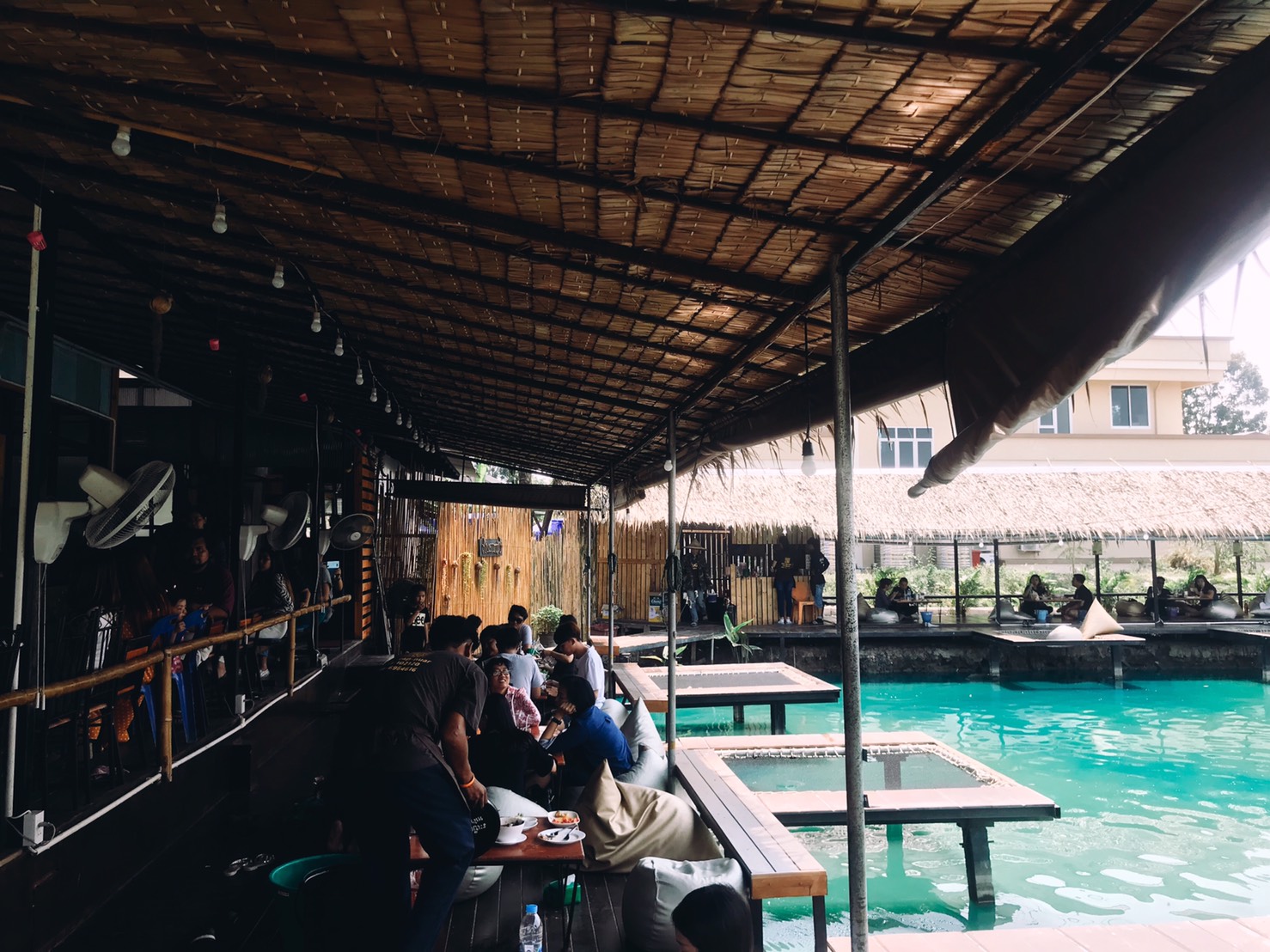 มีที่นั่งตาข่าย ยื่นลงไปในสระน้ำด้วย แต่ควรจะเป็นตอนเย็นๆจะชิลล์ และถ่ายรูปสวยมาก ถ้าตอนกลางวันจนถึงบ่ายจะร้อนมากเช่นกัน