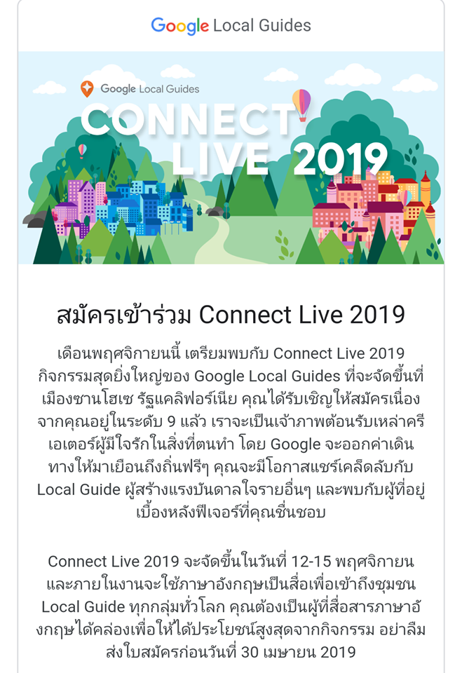 พอดีเพื่อนสนิทผมได้รับ mail จาก google ให้ไปร่วมงาน connect live 2019 ซึ่งเป็นงานของ google local guide ซึ่งเพื่อนผมอยู่ในระดับ 9 จึ่งได้รับเชิญไป