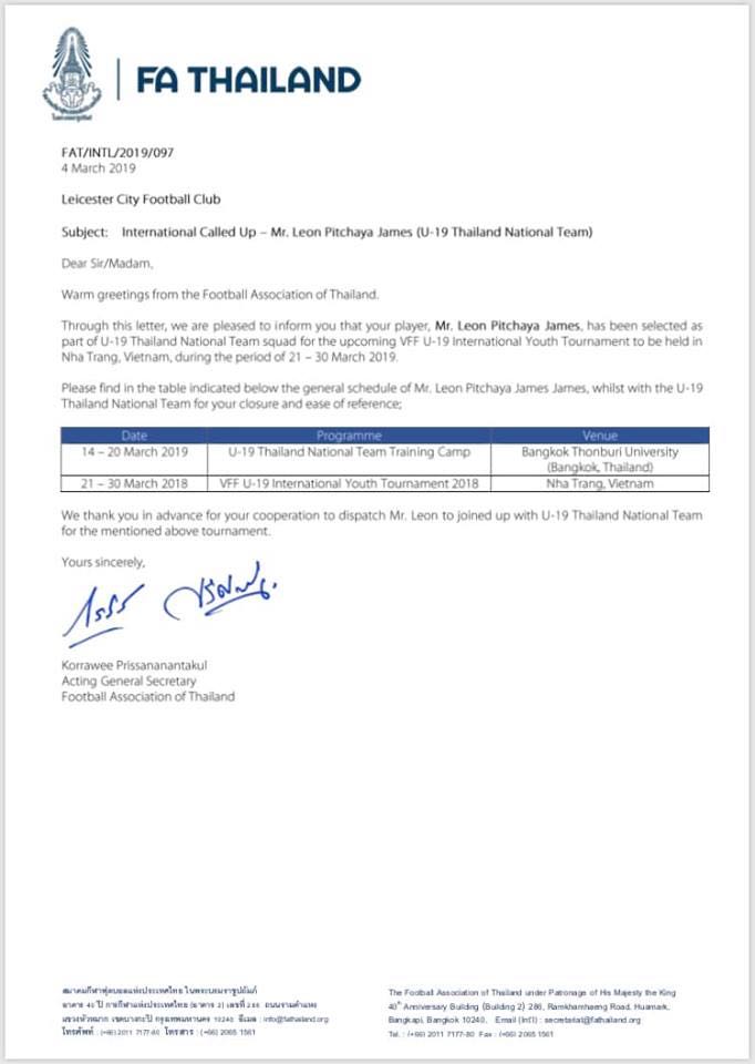สมาคมทำหนังสือเรียก ลีออน เจมส์ จากพรีเมียลีก รุ่น 18 ปี ลีกเยาวชนที่ดีที่สุดในยุโรป มาติดทีมชาติไทย