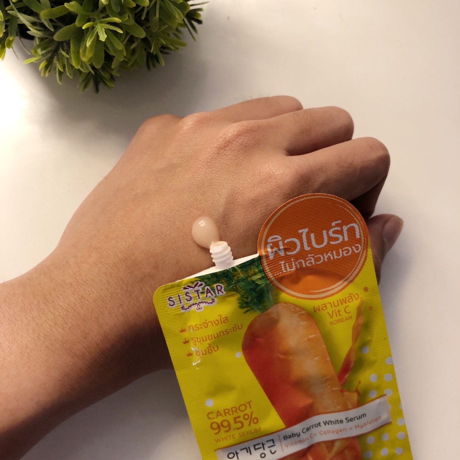 นั่นแหละครับ อย่างที่บอกไปว่ามันเป็นความบังเอิญมากๆที่ผมเนี้ยได้ไปเจอกับไอ้เจ้าเซรั่มตัวนี้ ผมใช้แล้ว รัก รักเลยยยยรักมากๆด้วย5555 Sistar Baby Carrot White Serum ตัวนี้นี่แหละครับที่ผมบอกไปเมื่อข้างต้น มันคือเซรั่มแครอทนั่นเองครับ มันจะช่วยลดปัญหาที่เกิดขึ้นบนใบหน้าของเรา เช่น รอยดำ รอยแดง ต่างๆ ทำให้หน้าเรากระจ่างใสขึ้นอีกด้วยย หลังซองนะครับเขาบอกมาว่า เซรั่มเบบี้แครอท อุดมไปด้วยสารสกัดจากเบบี้แครอท วิตามินซี คอลลาเจน และไฮยาลูรอน ที่จะช่วยฟื้นฟูและบำรุงผิวที่คล้ำเสีย แห้งกร้านเนี้ย ให้ดูดีดูกระจ่างใสขึ้น สีผิวสม่ำเสมอ รอยสิว รอยแผลเป็น จุดด่างดำแลดูจางลง ผิวเรียบเนียนละเอียด ชุ่มชื้น ดูอิ่มน้ำ และยังเหมาะกับทุกสภาพผิว เห็นมั๊ยทุกคนนนนน มันดีจริงๆ ไอ้เจ้าตัวนี้เนี้ย เนื้อสัมผัสมันคือเนื้อเซรั่มนะ ทาง่าย แห้งง่าย ซึมเร็วด้วยยย สบายๆไม่เหนียวเหนอะหนะเลย กลิ่นก็แอบหอมแครอทนิดๆ บอกเลยถ้าใครชอบกินแครอทนะ จะต้องหลงรักเจ้าเซรั่มตัวนี้แน่นอน