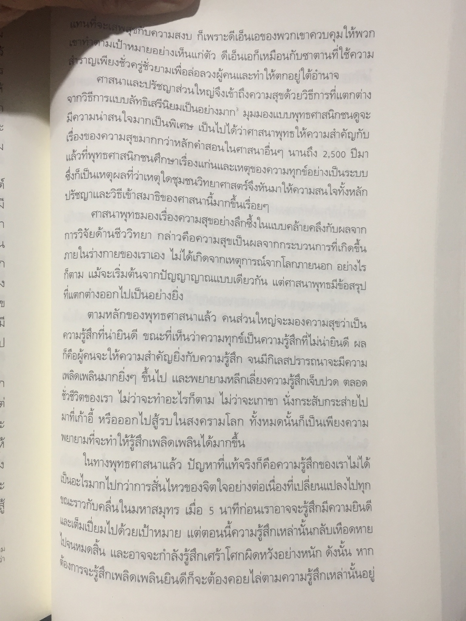 ...ศาสนาและปรัชญาส่วนใหญ่จึงเข้าถึงความสุขด้วยวิธีการที่แตกต่างจากวิธีการแบบลัทธิเสรีนิยมเป็นอย่างมาก มุมมองแบบพุทธศาสนิกชนดูจะมีความน่าสนใจมากเป็นพิเศษ เป็นไปได้ว่าศาสนาพุทธให้ความสำคัญกับเรื่องของความสุขมากกว่าคำสอนในศาสนาอื่น ๆ นานถึง 2,500 ปีมาแล้วที่พุทธศาสนิกชนศึกษาเรื่องแก่นและเหตุของความทุกข์อย่างเป็นระบบ ซึ่งก็เป็นเหตุผลที่ว่าเหตุใดชุมชนวิทยาศาสตร์จึงหันมาให้ความสนใจทั้งหลักปรัชญาและวิธีเข้าสมาธิของศาสนานี้มากขึ้นเรื่อย ๆ