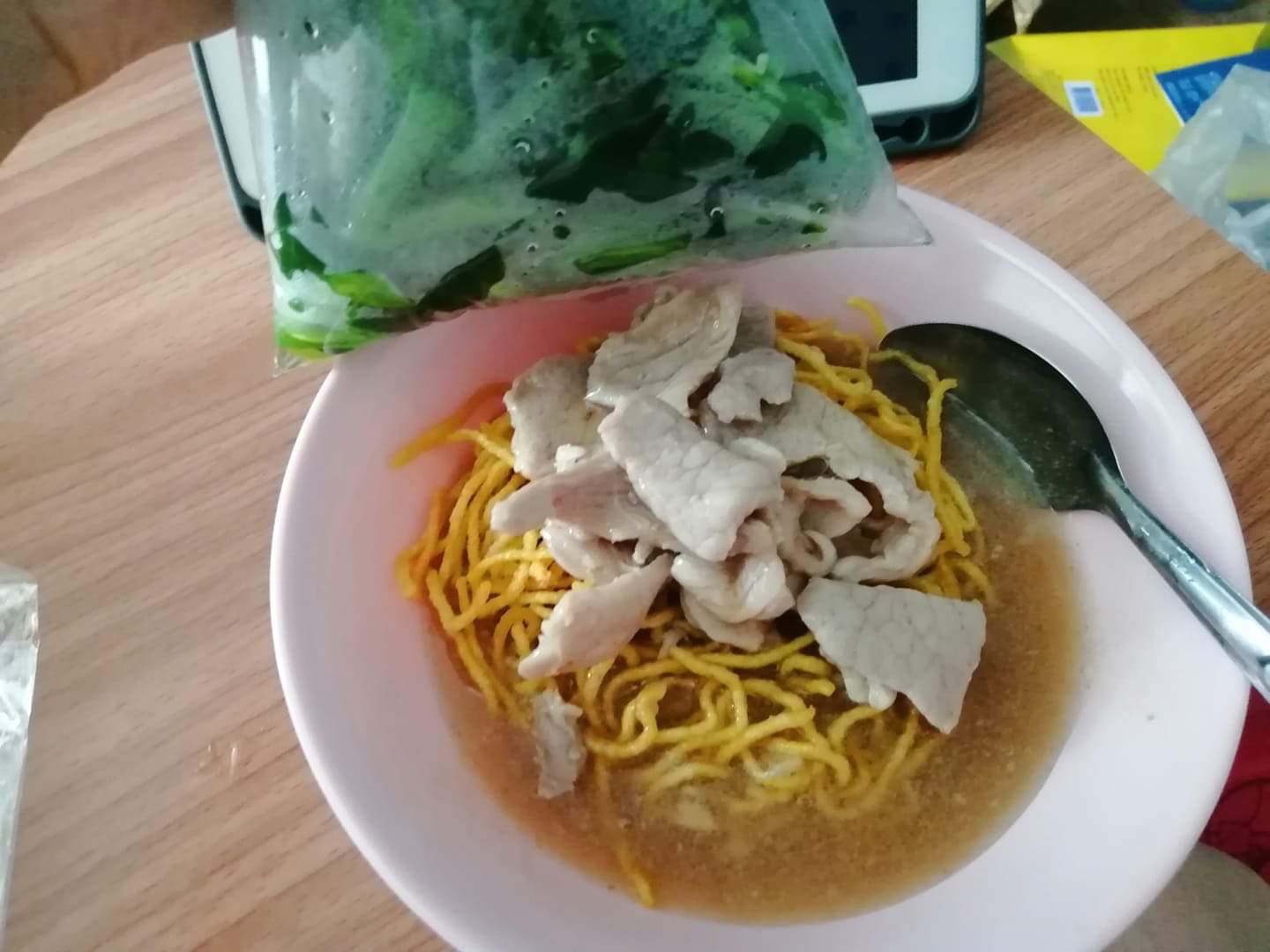 เห็นทีคงไม่อิ่มแน่ๆเลยแกะเกาเหลาราดหน้าหมูลงไปอีก เห้อ อุ่นใจ หมูค่อยเยอะขึ้นมาหน่อย แต่มันก็ยังน้อยอยู่ดี ขอไม่ใส่ผักเหมือนเดิมเพราะขมค่ะ