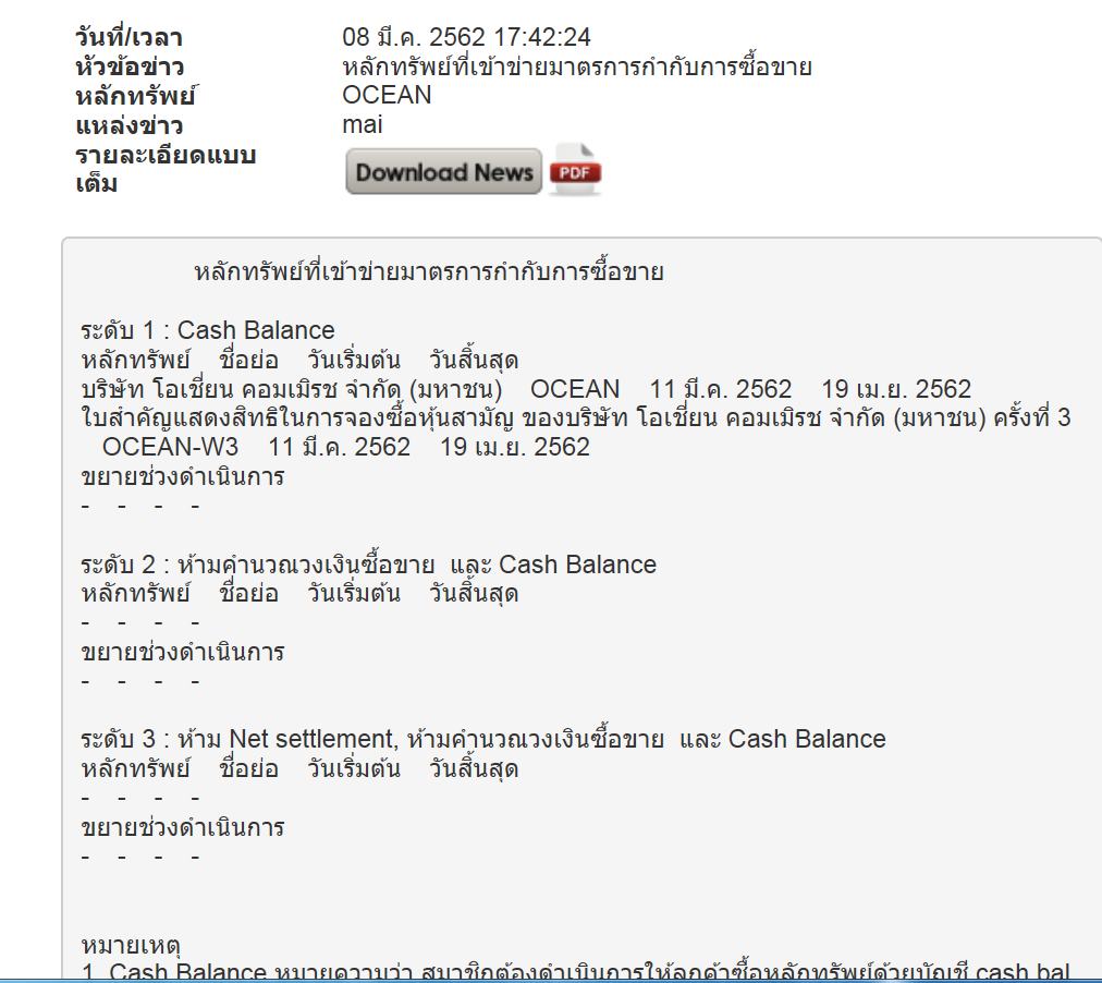 OCEAN & OCEAN-W3 : ตลท ประกาศโดน Cash Balance 11/3/2562 - 19/4/2562