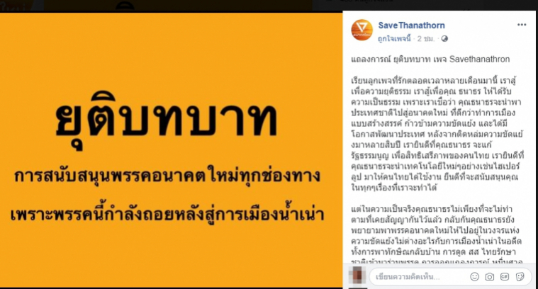 9 มี.ค.62 - เฟซบุ๊กแฟนเพจ SaveThanathorn ซึ่งสนับสนุนพรรคอนาคตใหม่ ของนายธนาธร จึงรุงเรืองกิจ มาอย่างต่อเนื่อง ล่าสุดโพสต์แถลงการณ์ ยุติบทบาท เพจ Savethanathron โดยมีเนื้อหาระบุว่า "เรียนลูกเพจที่รักตลอดเวลาหลายเดือนมานี้ เราสู้เพื่อความยุติธรรม เราสู้เพื่อคุณ ธนาธร ให้ได้รับความเป็นธรรม เพราะเราเชื่อว่า คุณธนาธรจะนำพาประเทศชาติไปสู่อนาคตใหม่ ที่ดีกว่าทำการเมืองแบบสร้างสรรค์ ก้าวข้ามความขัดแย้ง และได้มีโอกาสพัฒนาประเทศ หลังจากติดหล่มความขัดแย้งมาหลายสิบปี เรายินดีที่คุณธนาธร จะแก้ รัฐธรรมนูญ เพื่อสิทธิเสรีภาพของคนไทย เรายินดีที่คุณธนาธรจะนำเทคโนโลยีใหม่ๆอย่างเช่นไฮเปอร์ลูป มาให้คนไทยได้ใช้งาน ยินดีที่จะสนับสนุนคุณในทุกๆเรื่องที่เราจะทำได้