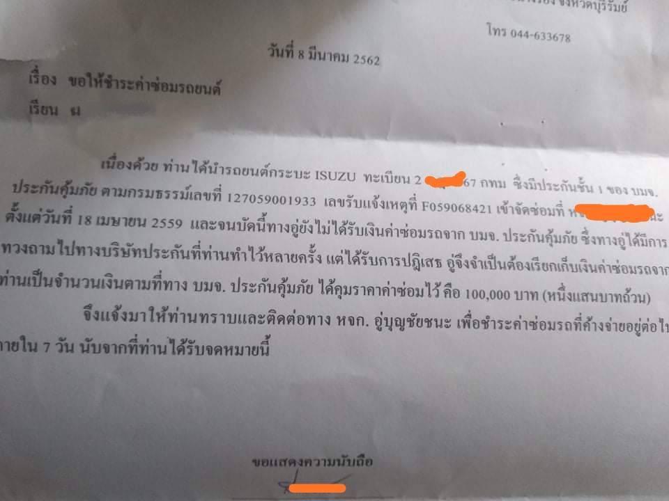 เมื่อประมาณเมษายน 2559 เราขับกลับจากบ้านจะเข้ากรุงเทพ เกิดอุบัติเหตุขับรถยนต์ชนกับรถเก๋งที่เค้าชนเสาไฟฟ้าและขวางทางเราอยู่ (เราขับตามคันข้างหน้า คันข้างหน้าหลบกะทันหันแล้วเรามองไม่เห็น) เรียกประกันปกติ เคลียร์ที่สน. เรียบร้อย ได้ใบเคลมประกันปกติ สรุป ณ วันนั้นก็แยกย้าย เราเอารถเข้าอู่ตั้งแต่หลังสงกรานต์ ทวงถามทางอู่ก็เลื่อนแล้วเลื่อนอีก ให้ประกันช่วยเร่งก็แล้ว สรุปได้รถอีกทีสิงหาคม เรานึกว่าเรื่องเรียบร้อย กลายเป็นว่า วันนี้ 8 มีนาคม 2562 มีจดหมายจากอู่แจ้งมาที่บ้านว่าประกันไม่จ่าย ให้เราเข้าไปจ่ายให้ งงมากค่ะ เพราะปัจจุบันยังใช้ประกันเจ้านี้อยู่ ตอนต่อก็ถามว่าเคลมหมดไปเท่าไหร่ เค้าบอกประมาณ 80000 บาท (ก็ยังอยู่ในวงเงินของกรมธรรม์) เลยเพิ่มเบี้ยปีถัดมาอีกนิดหน่อย เลยคิดว่าเรื่องมันจบ พ่อเป็นคนรับจดหมายเมื่อเช้า แกตกใจมากเลยค่ะ ไม่เคยเจออะไรแบบนี้เรื่องเงินเราควรทำยังไงดีค่ะ ขอคำปรึกษาหน่อยค่ะ