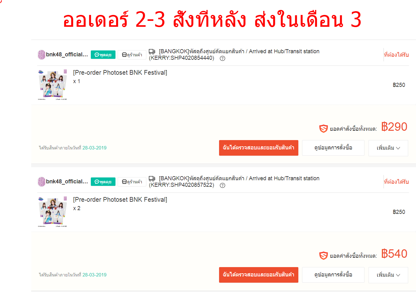 แต่ออเดอร์ที่ผมสั่งอีกหลังอีก 2 ออเดอร์ (สั่งเพิ่มเติม ในวันที่ 23 กุมภา) กลับมีสถานะเตรียมจัดส่งแล้ว